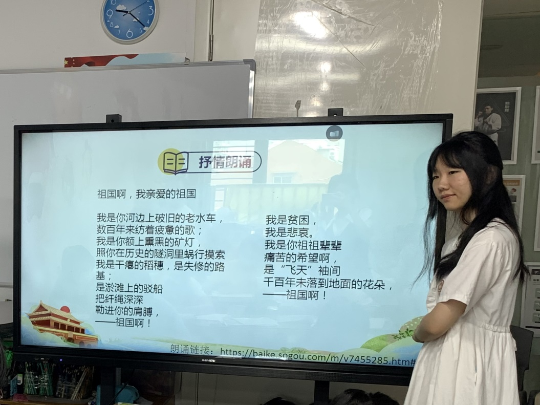 此外,队员黄杰开展了朗诵专项课堂,教孩子们朗诵《祖国啊,我亲爱的祖国》。在教学普通话朗诵技巧的同时展开学生的爱国主义情怀培养教育。