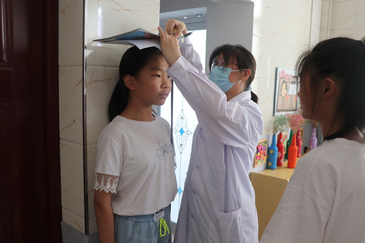 为做好体检工作,团队成员提前做好组织安排,认真按照体检标准对学生进行检查。班主任张若婷提前领取并发放体检表,引导同学们填写表头基本信息,全程陪护体检。体制检测分为身高、体重、腰围测量,视力色觉检查以及血压测量项目。在此过程中,体检人员为经过培训的团队成员,他们对每个学生进行了认真细致的检查。孩子们都积极配合,有些学生怀着好奇,有的孩子则怀着担心。检查后,孩子们耐心倾听意见,还询问其他的卫生知识,大家脸上都露出了灿烂的笑容。体检结束,团队成员们根据所记录的体检信息给学生普及相关卫生知识,并对体检结果做了详细记录并反馈给家长。