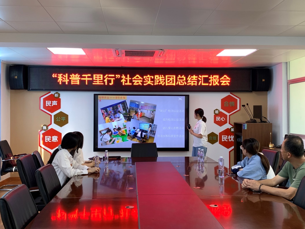 会议内容分为社会调研、爱心公益和文化学习三个板块。包含关于先锋村乡村振兴方案的调研、关于居民普通话使用情况的调研、“碳13”公益活动、视力检测公益活动、幼儿爱心支教活动、防溺水科普宣传活动、海姆立克急救法科普宣传、茉莉花茶文化学习与宣传和革命历史纪念馆党史学习等一系列社会实践活动。队长陈思婕整理总结了活动中取得的收获与成就,也针对活动过程中存在的不足,进行了深度反思与研究改进。