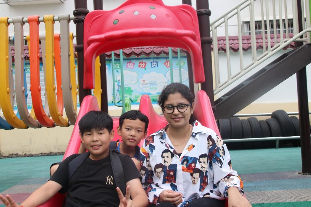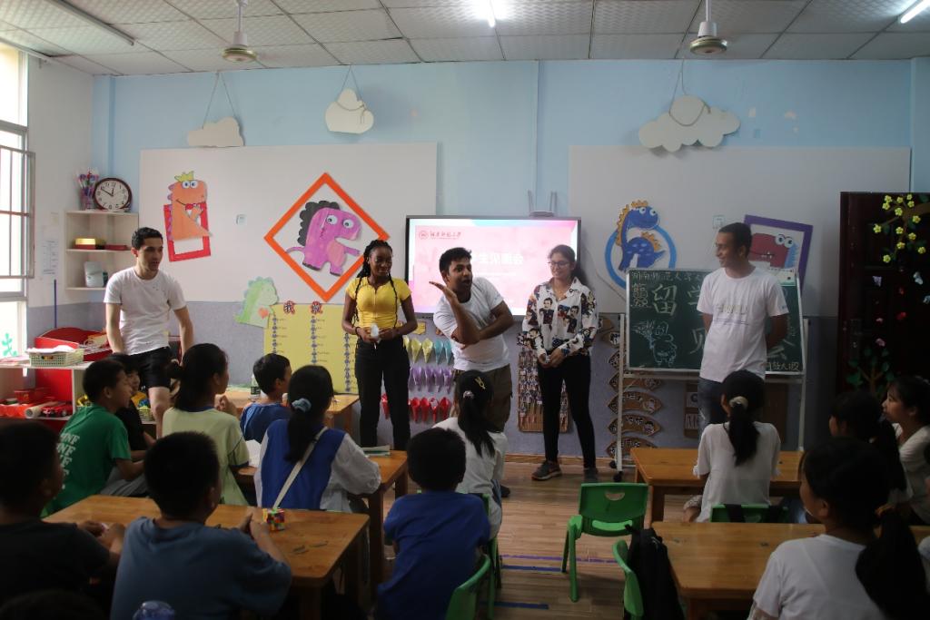 实践团队的留学生们聚集在教室内向小朋友们逐个进行自我介绍。巴基斯坦籍留学生Kelvin用幽默诙谐的口吻以及形象欢快的肢体语言使简单的自我介绍变得轻松有趣。随后,印度籍留学生宋佳、也门籍留学生马里克、赞比亚籍留学生马露、叙利亚籍留学生袁赞依次进行向学生介绍自己以及家乡。学生们在Kelvin游戏的方式下也按照顺序介绍自己以及兴趣爱好等基本情况。在初步认识后,留学生与夏令营学生进行趣味破冰游戏——听音乐抢凳子。破冰游戏增进了同学与留学生之间的友好关系。见面会结束后,留学生们一一配对护送住址距离较远的的小朋友们安全回到家中。