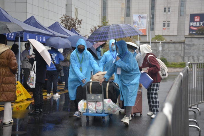 10月9日,我院2022级研究生新生入学报到,我院团委青年志愿者工作部组织志愿服务工作,青年志愿者工作部成员以及我院招募志愿者参加此次活动。 上午,50余名志愿者早早来到综合楼前坪迎新点处提前了解工作内容,身穿雨衣戴好口罩,时刻做好迎新准备。志愿者严格遵从疫情防控要求,查看了研究生新生的健康码、行程码以及有无高风险地区旅居史,确认无误后帮助他们搬运行李,引导新生顺利入住宿舍并熟悉校园。学院领导、相关部门老师也积极参与到服务工作中,对家长车辆进行管理。在所有行李进行消毒杀菌后,志愿者将研究生带领至食堂前坪处进行报道并派发学校文创产品,迎新工作有条不紊地进行着。