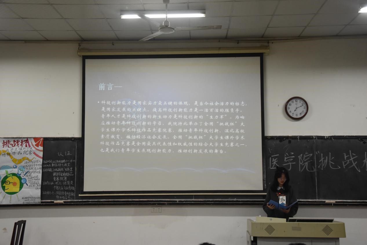 10月28日晚,第十八届“挑战杯”大学生课外科学技术作品竞赛院赛在我院勤医楼七教室展开。竞赛邀请到院党委副书记陈松、副教授邹辉、微生物学与免疫学检验教研室的讲师钟志宏担任评委,2022级药学班万雨欣担任主持人,共有八支队伍参与比赛,我院部分学生通过腾讯会议观看此次活动。
