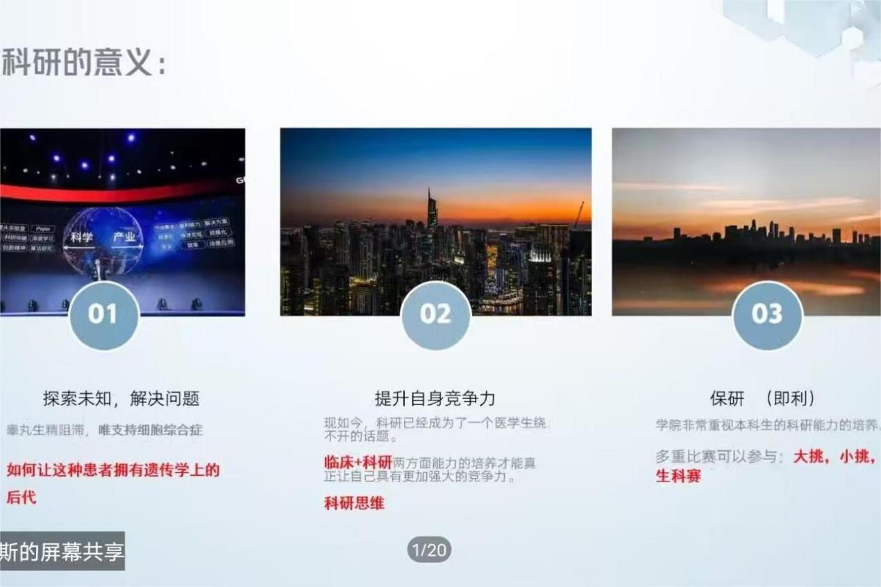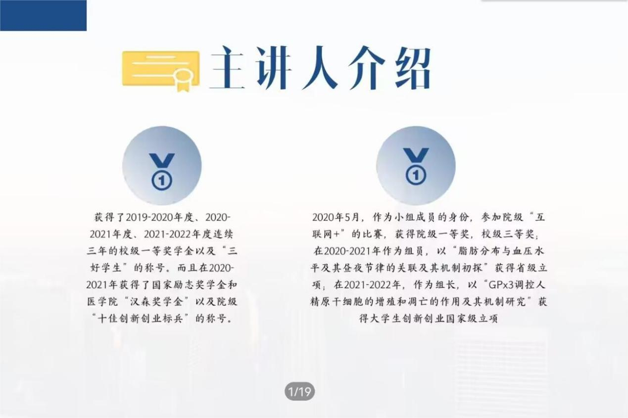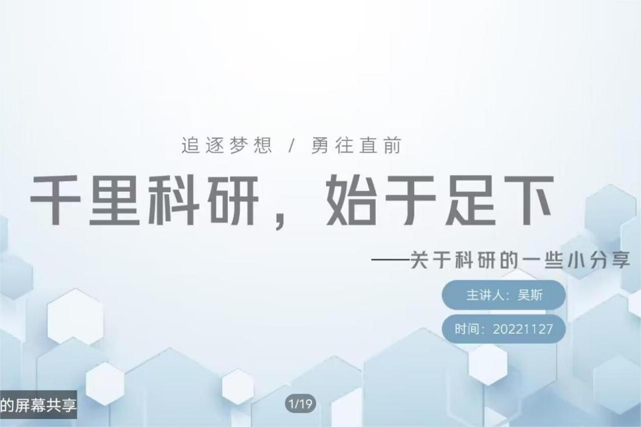 11月27日晚,我院团委青年创新创业工作部以腾讯会议为平台,采取线上讲学方式,开展了主题为“千里科研,始于足下”的精勤讲堂,此次精勤讲堂由我院20级卓医班吴斯主讲,22级临床班甄帅担任主持人。