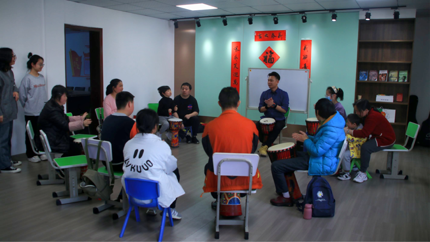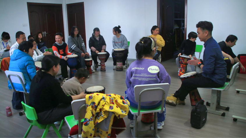 老师与志愿者们提前在教室等待小朋友们的到来。在引导孩子们顺利完成签到后,形体课便正式开始。老师带领大家依次完成基本形态练习,其中部分动作对孩子们来说稍微有点困难,但在志愿者们的带领下小朋友们也基本完成。在接下来的非洲鼓课上,老师先用一首节奏很强的歌曲将大家带入课堂氛围之中,通过《大中国》、《告白气球》等歌曲的节奏练习,带大家复习了上节课的学习内容知识,遇到较难的节奏型,老师会一个个的进行教学,志愿者们也加入其中陪伴上课。随着时间的流逝,今天的陪伴活动在美妙的鼓声中圆满结束……