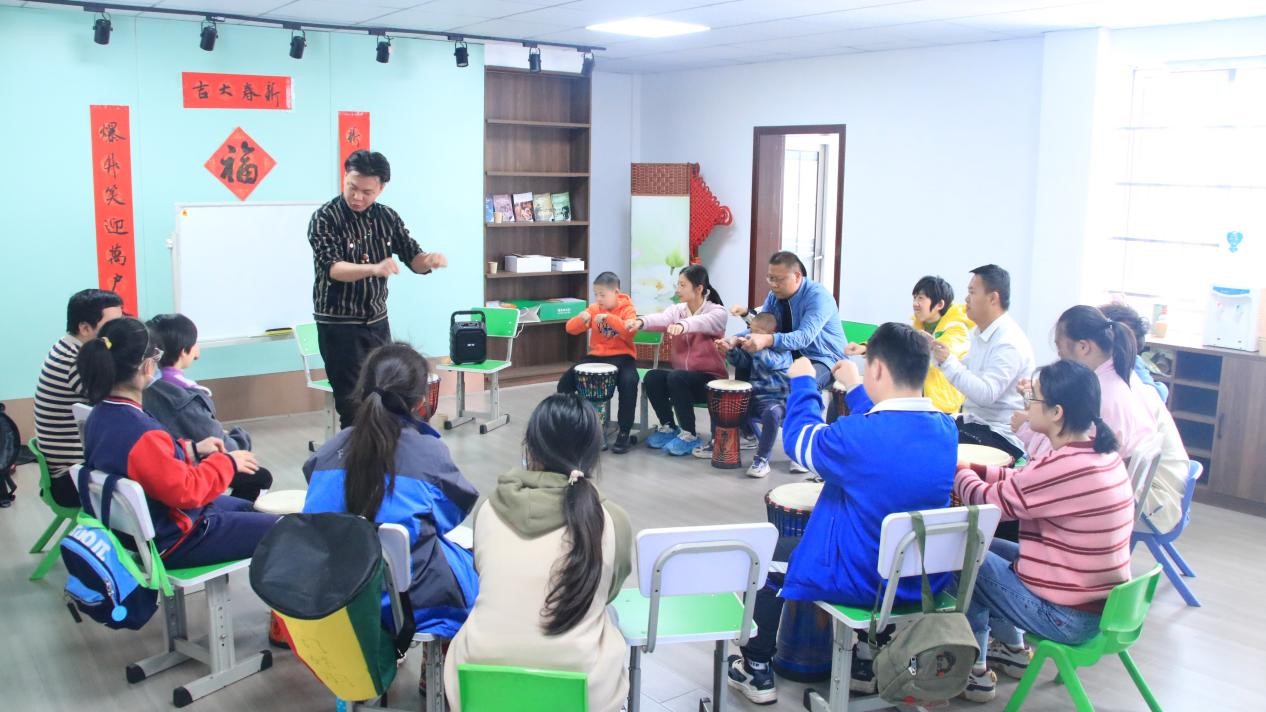 老师和志愿者在舞蹈室等待小朋友们的到来,在志愿者的帮助下顺利完成签到后便展开形体课。老师先带领大家做热身活动,志愿者们示范并教导孩子们完成基本形体动作。在之后的非洲鼓课上,老师带领大家复习了上节课的知识。随后,学习了《大中国》和《下山》两首歌的拍鼓节奏,志愿者们也参与其中,帮助孩子们更好地掌握拍鼓技巧。在欢快的节奏声中,今天的活动圆满结束。
