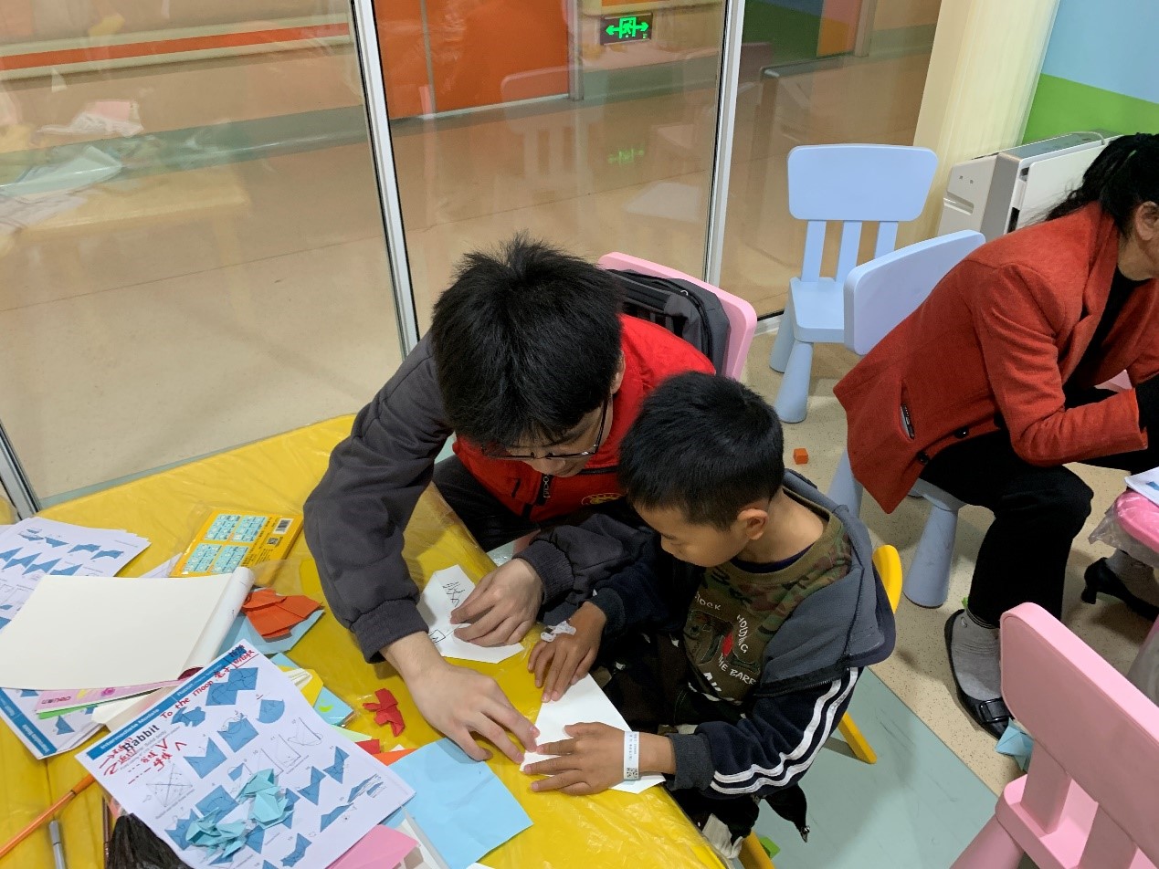 我院青年志愿者工作部在院内提前招募10余名志愿者构成服务小组,并依据个人特点和意愿进行分组培训。志愿服务时,一组志愿者负责看管并维护迪士尼小屋内物品。另一组则负责邀请病房里的小朋友们前来迪士尼小屋,并带领小朋友们一同折纸、画画,与孩子们一起搭积木、玩拼图。用心陪伴,共同成长。志愿者们在与孩子们相处的过程中敞开心扉、真诚交流,彼此成为了好朋友,孩子们在志愿者的帮助下掌握了知识,获得了快乐,善良纯真的孩子们同时也治愈了志愿者的心灵。