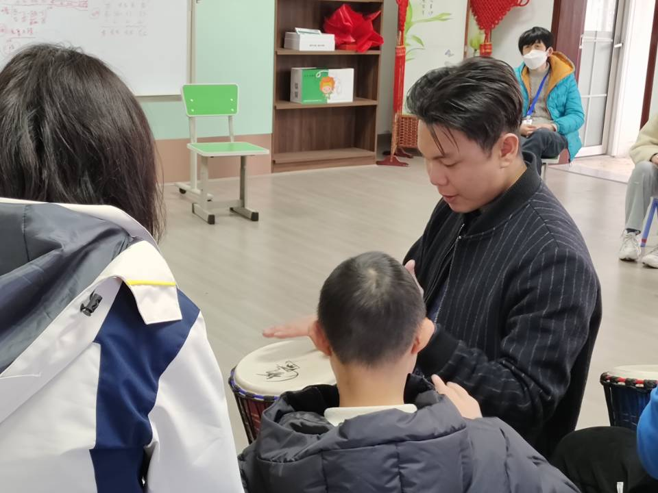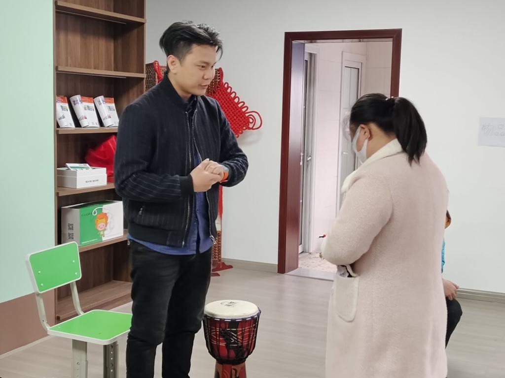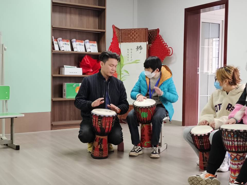 此次活动的内容是陪伴并辅导患有唐氏综合症的孩子参加非洲鼓课。志愿者们引导小朋友进行签到后,非洲鼓课正式开始。课上,老师先用一首节奏欢快的歌曲将大家带入课堂氛围之中。随后通过《大中国》、《告白气球》等歌曲的节奏练习,带大家复习巩固了上节课的内容知识。遇到较难的节奏时,老师会一个个的进行教学,纠正小朋友们错误的节拍,志愿者们也加入其中陪伴上课,不断鼓励每位小朋友。