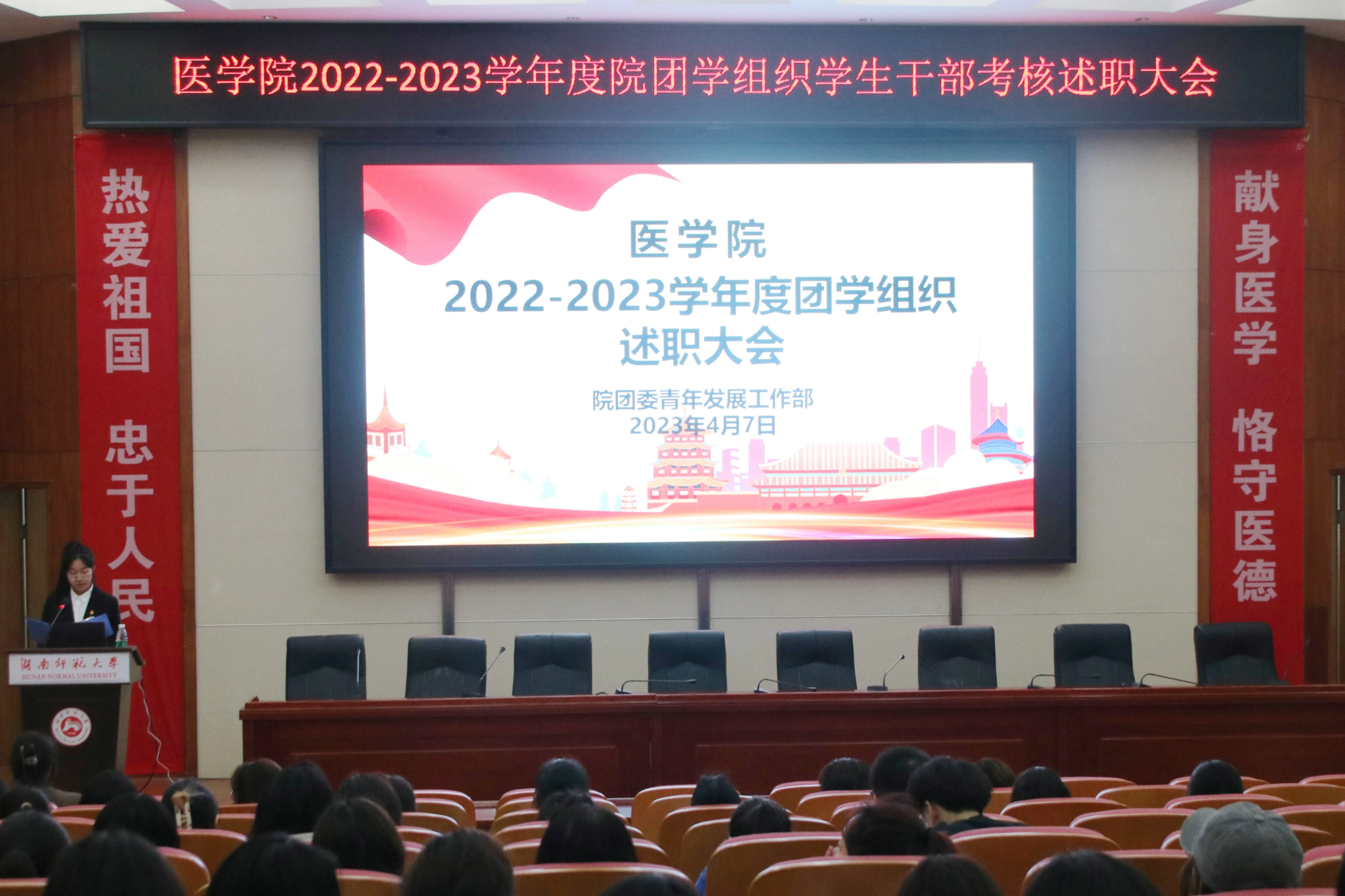 为加强学生干部队伍建设,4月7日晚,我院在学术报告厅举行2022-2023学年度院团学组织学生干部考核述职大会。此次大会由院团委青年发展工作部主办。我院2022级五年制辅导员朱天爱、院团学组织主席团成员、学生评议代表以及院团委青年发展工作部成员参与了此次会议。
