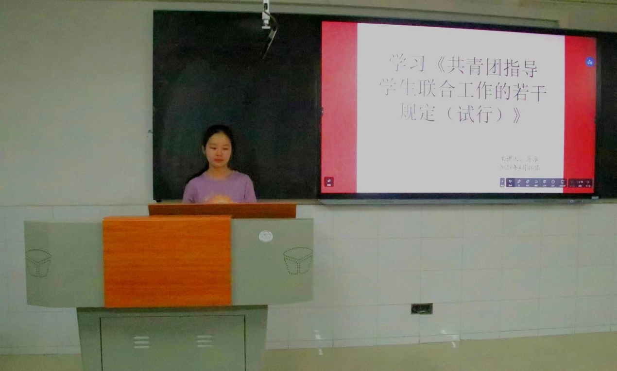 4月16日晚,我院学生会办公室主办的以“学习《共青团指导学生联合工作的若干规定(试行)》”为主题的红色文化学习活动在仁医楼教室204开展,此次活动由22级卓医班蒋冰主讲,学生会全体成员参加。