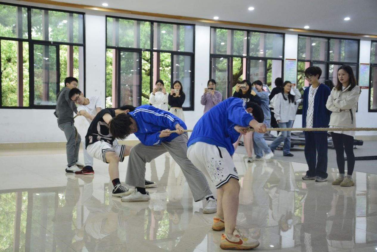 负责人讲解比赛规则后,参赛者做好相应赛前准备活动,趣味运动会正式开始。率先开展的是“三人四足”。随着裁判员一声令下,各小组成员或喊着口号默契前行,或停滞原地举步维艰,亦或是跌跌撞撞冲向终点。拔河比赛过程中,参赛者竭尽全力向后拉绳,直至比赛结束。观众的加油声、参赛者的嘶吼声将活动推入了高潮。休息片刻后,“袋鼠跳”“四渡赤水”“龟兔赛跑”三个环节按规定依次开展。在一片笑声、欢呼声、呐喊声中,此次趣味运动会活动降下了帷幕。