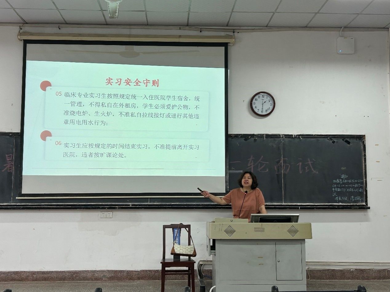 实习办主任赵燕玲强调了实习安全问题,并提醒同学们做好实习前的各项准备、实习期间严格履行学生外出请、销假手续以及实习期间轮科时间要求。