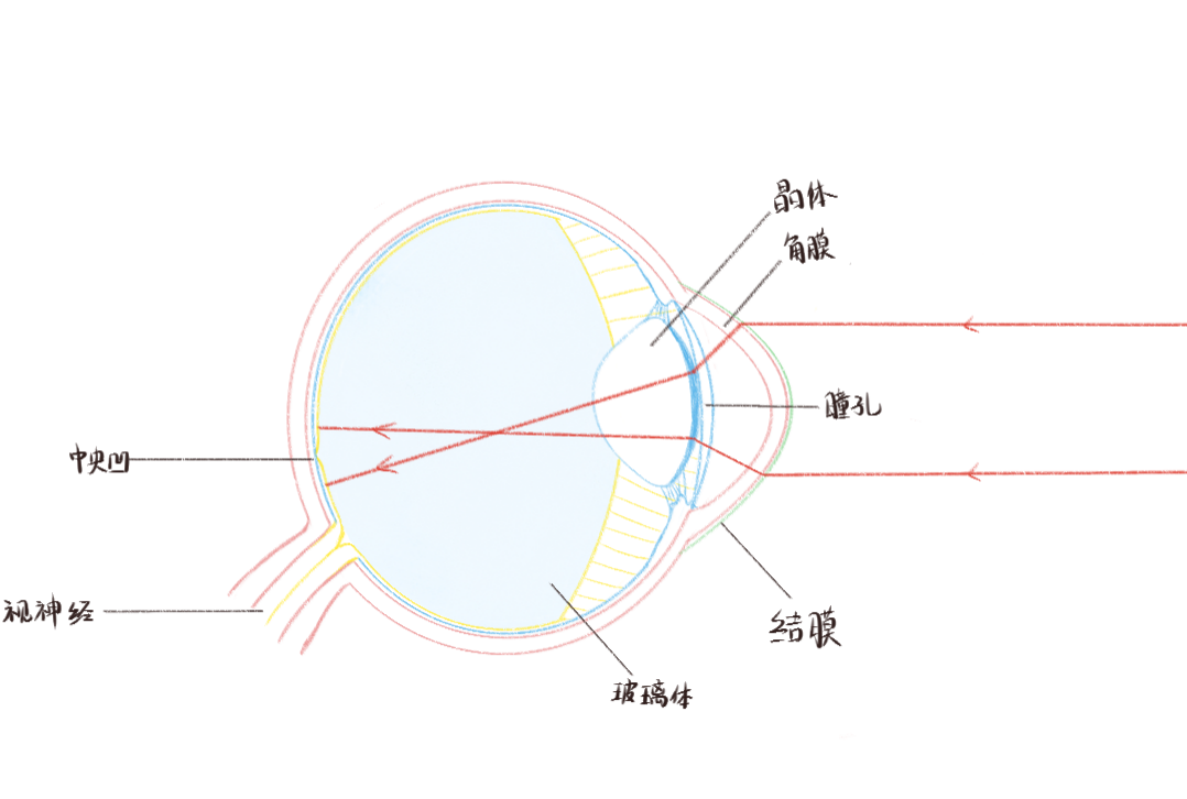 我们通常说的近视主要是眼睛的折光系统出现了问题,即当眼睛的屈光力过强或眼球前后径过长,光线经过角膜和晶状体折射后,聚焦在视网膜前方,而不是正好落在视网膜上,这就打破了折光系统这份精妙的平衡。这样一来,视网膜收到的是“模糊的光斑”,大脑处理后就变成了远处物体的模糊影像。
