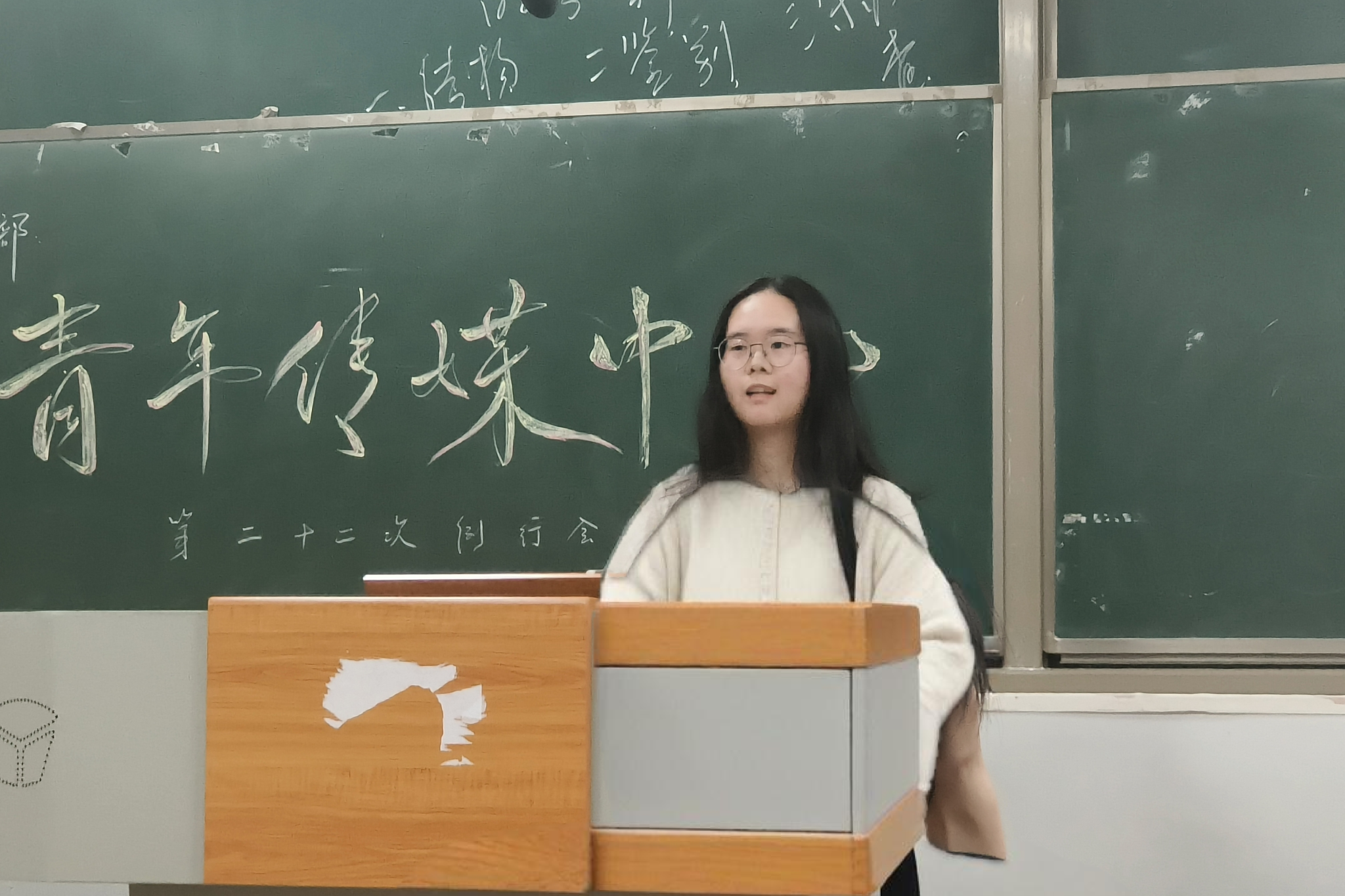 紧接着,副主任江欣、袁宇宸、吴金金依次上台致辞。她们将自己大学最美好的时光奉献给了青传,在三年的任职中,最初的那份热爱早已变成了肩上沉甸甸的责任。她们纷纷表示,这次的离别只是为了将来更好的重逢,并寄语第十三届“小青梅”们,希望他们能够带领青传迈向新的高度。