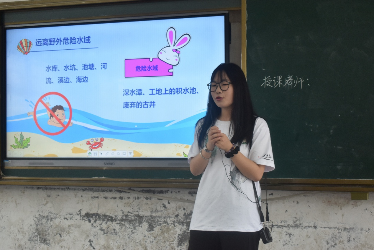 活动中,实践团成员围绕“远离野外危险水域”“游泳注意事项”“同伴落水如何应对”“不慎落水如何自救”四大核心内容展开科普。在“远离野外危险水域”环节,成员们结合典型案例,详细列举了水库、池塘、工地积水池等危险区域,剖析了野外水域存在的隐患,引导孩子们从思想上筑牢安全防线。针对游泳安全,实践团成员讲解了科学游泳的注意事项。在应急处置教学中,成员们重点演示了同伴落水后的正确施救方法。对于不慎落水后的自救技巧,成员们通过情景模拟和视频演示,告诉孩子们正确的自救方法。