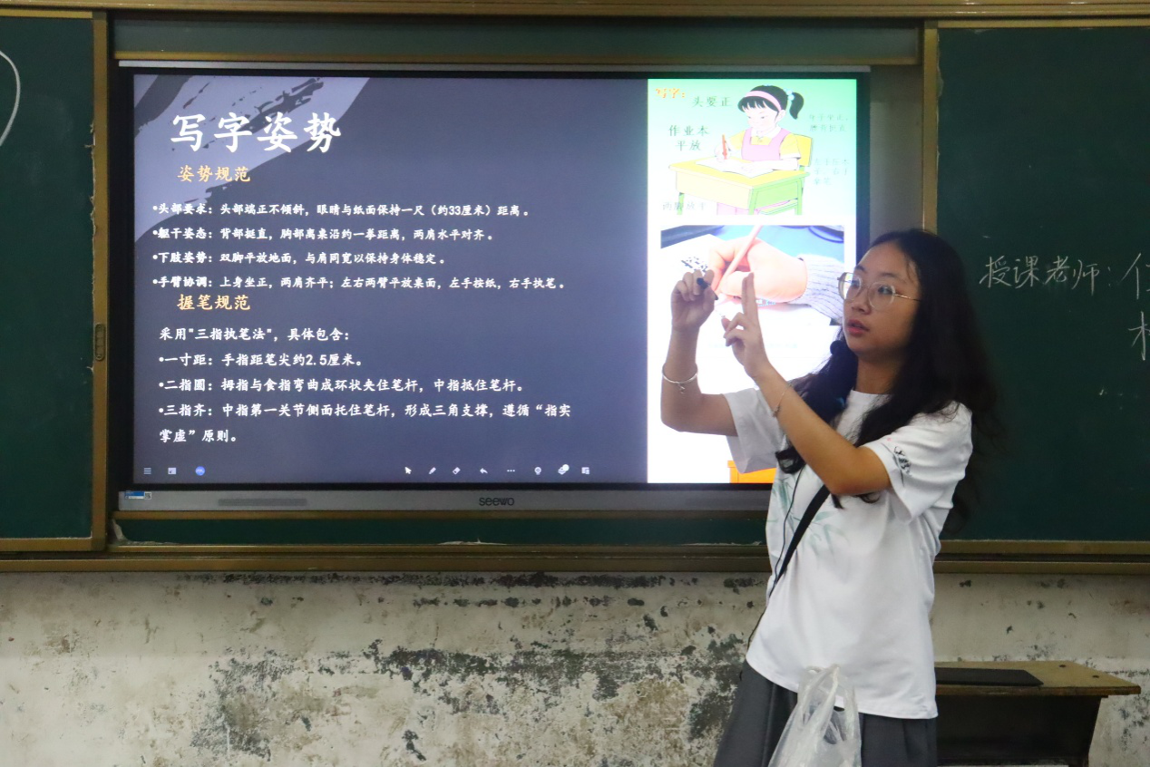 此次课程由“汉字起源”“基本笔画”“字体结构”三个板块构成。在 “汉字起源”环节,团队成员以甲骨文为切入点,通过视频展示与故事讲解,系统梳理汉字从甲骨文到楷书的演变脉络;练习书写环节,主讲人细致示范横、竖、撇、捺、点等基本笔画的书写要领,并在练习过程中对学生逐行指导,纠正学生握笔姿势与运笔力度,针对常见错误进行现场演示。团队成员还对常见字字体结构进行教学,对于独体字,要注意重心平稳;对于合体字,则要讲究各部分的比例协调。学生们对照范例反复临摹,从最初的结构松散到逐渐掌握平衡之道,书写作品质量显著提升。