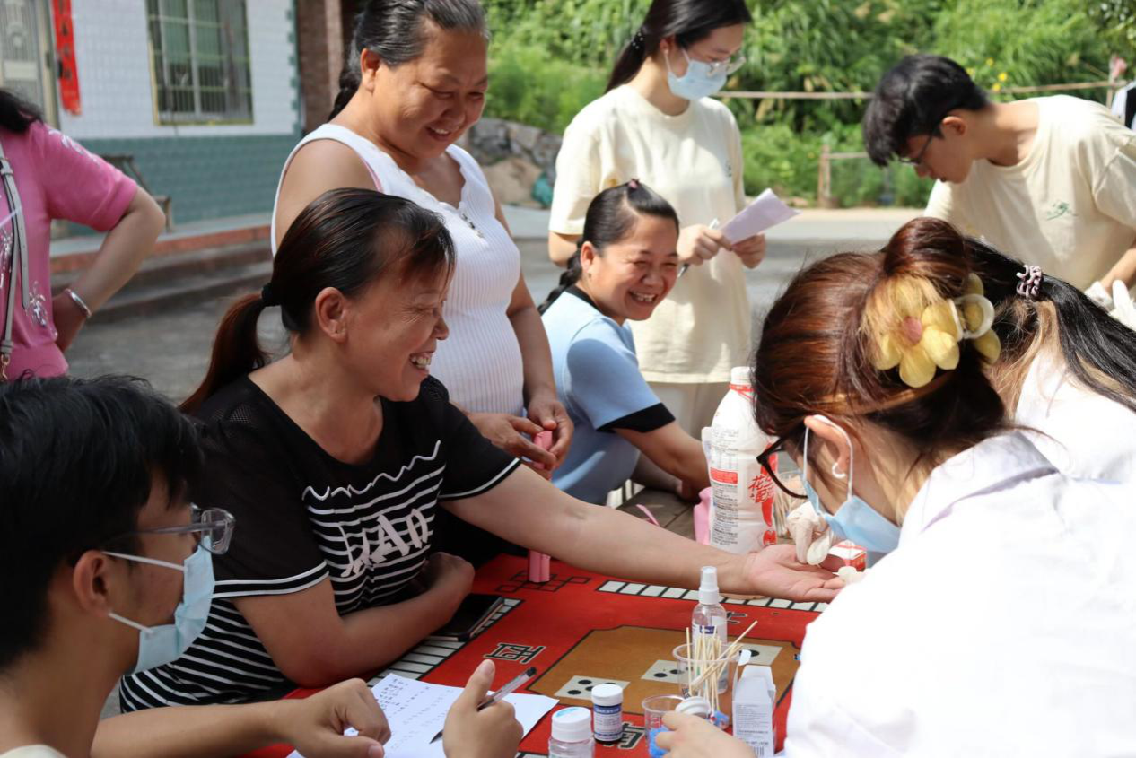 7月12日上午,志愿者们提前抵达后迅速布置场地,备好血压计、血糖仪等仪器,面向村民开展无偿服务,包括测量血压、血糖、血型、视力及身高体重,并提供健康咨询与爱心推拿。志愿者们耐心询问村民的身体状况,结合测量结果给出针对性健康建议,同时记录数据,为了解当地基层健康状况积累第一手资料。不少村民在体验推拿服务后,对志愿者的专业手法表示认可。