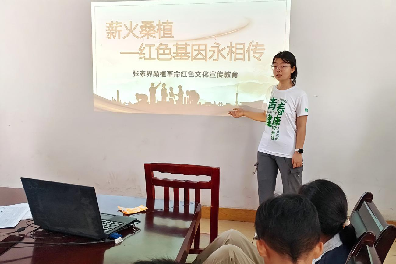 本次宣讲分为“地理位置”“红色故事”“革命先烈”“地方发展”“青年奋斗”五个部分。主讲人以重要的地理位置为引,向观众讲述桑植革命历史。实践团成员重点讲述了贺龙元帅的英雄事迹,助力弘扬红色精神。