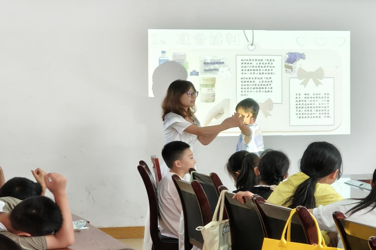授课教师通过课件展示,将不同血型及其相关知识以课堂互动形式讲述出来。课程结合血型测试方法形象告诉学生们血型的分类,重点科普输血类型,如何正确输血以及稀少的"熊猫血"。邓雯丽通过实际操作展示血型检验步骤,补充学生们对血型检验知识的缺乏,帮助学生们克服对血型检验的恐惧。在输血知识科普环节中,邓雯丽采用"我问你答"的趣味方式,带动了学生们学习血型的积极性,帮助学生们树立血型安全意识。