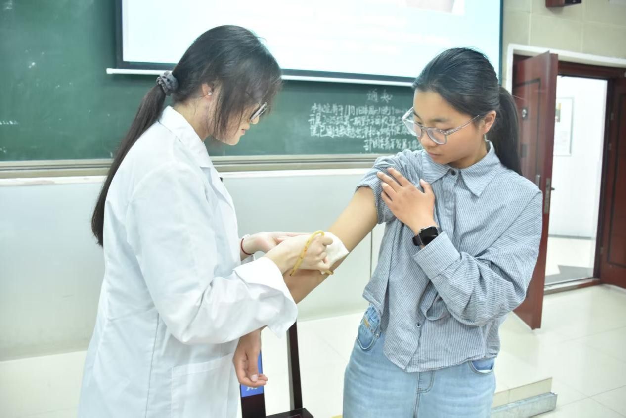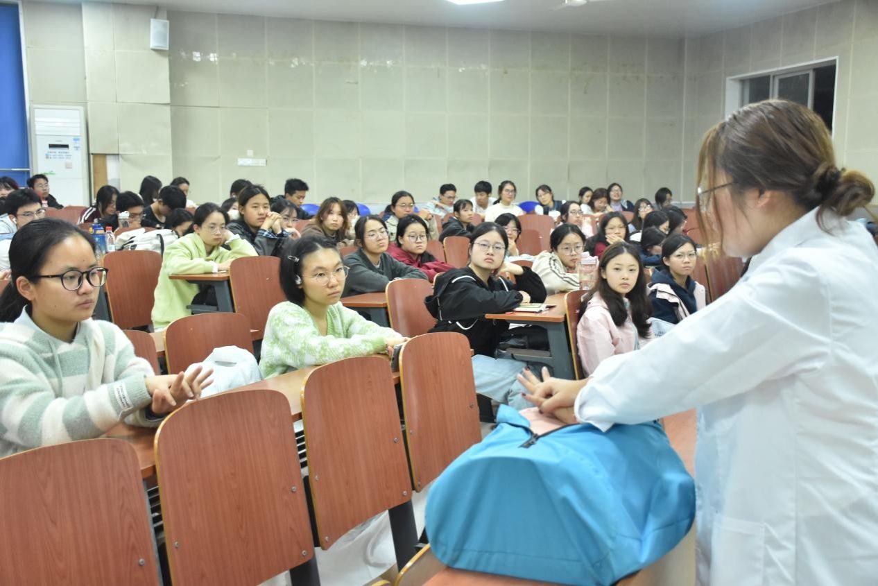 课堂上,郝思嘉以心肺脑复苏为主题开展讲授,对基础生命支持的核心流程予以详细解读。她对各个动作要领进行逐一拆解,内容涵盖现场安全评估、意识与脉搏判断,以及胸外按压、开放气道、人工呼吸等规范操作。同时,她强调了“黄金抢救4分钟”的重要意义,并结合AED设备使用方法的演示,帮助新生能够直观地掌握急救关键技能。随后,马亚梅以外伤急救为核心,系统地讲解了外伤判断、清洁消毒、止血与包扎四大板块。她通过实例来帮助同学们区分不同血管的出血特点,演示了加压止血、指压止血、止血带止血等实用方法,以及三角巾、绷带的多种包扎技巧,并强调操作需遵循“快、准、轻、牢”的原则。