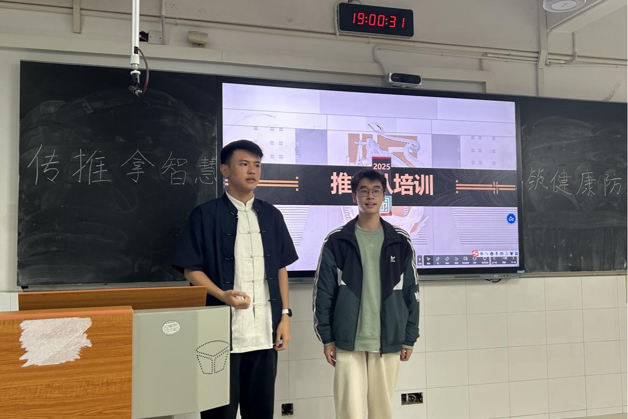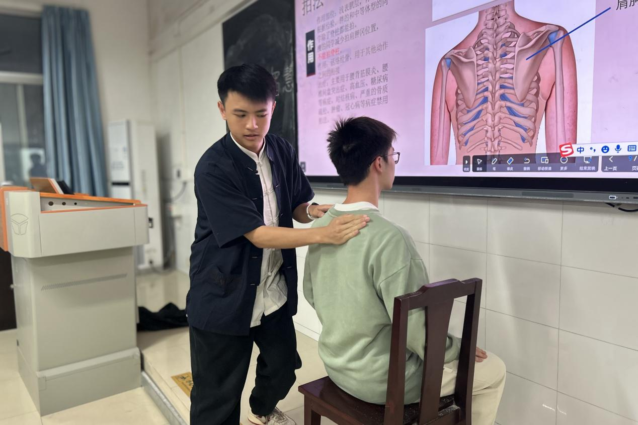 团课过程中,谭玥和冯靖哲围绕“传推拿智慧,筑健康防线”主题展开讲授。课程内容包括推拿的简介、脖颈穴位、常见手法分类及其操作要点。他们详细介绍了拍、㨰、拿、推、按的手法功效和注意事项,并选取大椎穴、天柱穴等常用保健穴位,进行了部位定位与手法操作的分解演示。随后便到了答疑互动环节,同学们在推拿队成员的指导下,分组进行实践操作练习,针对肩颈放松等常见需求模拟应用所学手法。