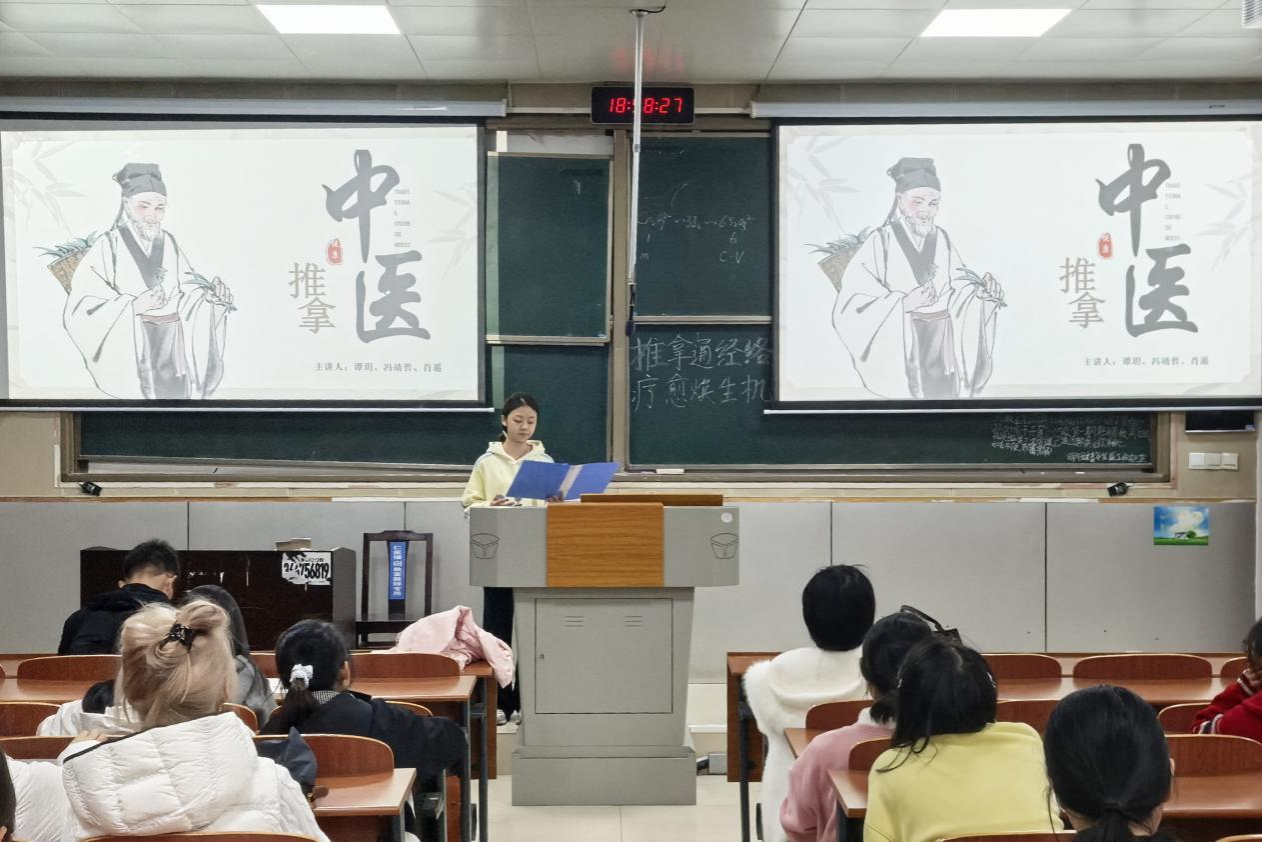 课堂上,主讲人围绕推拿的基本理论与实操手法开展讲授。课程结合中医经络理论,从骨骼定位入手,详解了主要肌群的放松技巧,阐释了推拿调和气血、疏通经络的作用原理。在理论知识的基础上,主讲人演示了拍、㨰、拿、推、按等多种实操手法。为帮助同学们深入理解相关知识,提升实践技能,此次课堂设置了实操环节。主讲人邀请学员现场演示了“拿五经”等经典操作,并对其不足之处进行纠正。同时,主讲人强调手法需做到“柔中带刚,力透肌理”,避免暴力施术,确保操作安全有效。