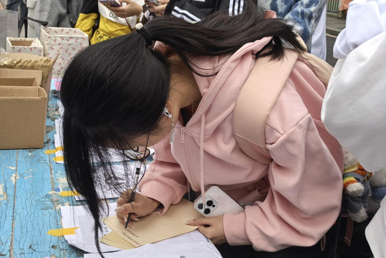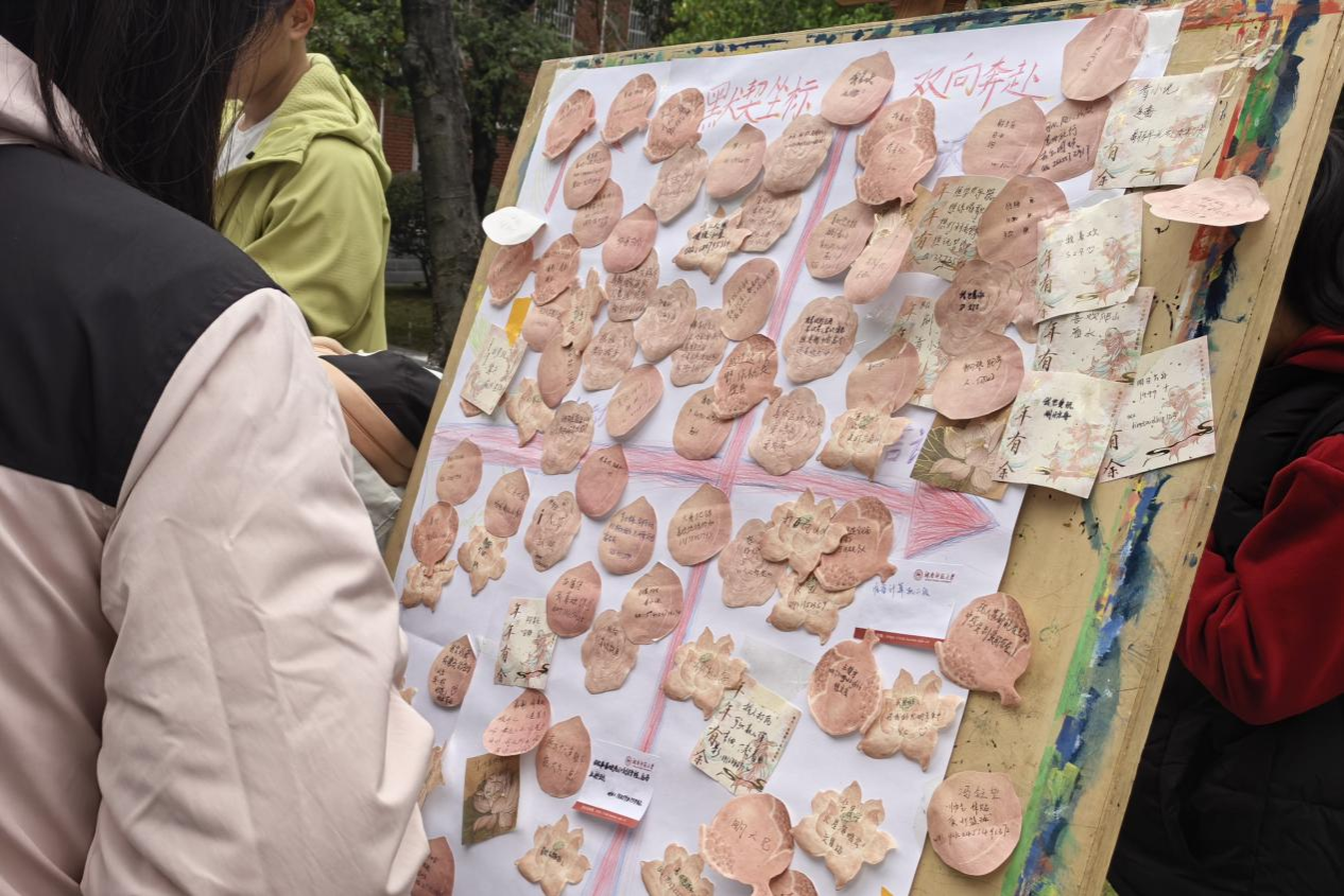 在线下摆点处,告白节也开设了多个分活动。同学们可以把对亲友的祝愿写在折纸作品中向对方传递;也可以参与“信语解忧铺”的表达与回应环节,借此锻炼共情沟通与情绪管理能力;在画板上贴写有自身性格爱好的便利贴,并附上自己的联系方式,以此结交新朋友,帮助同学们相互了解,扩大交友圈。