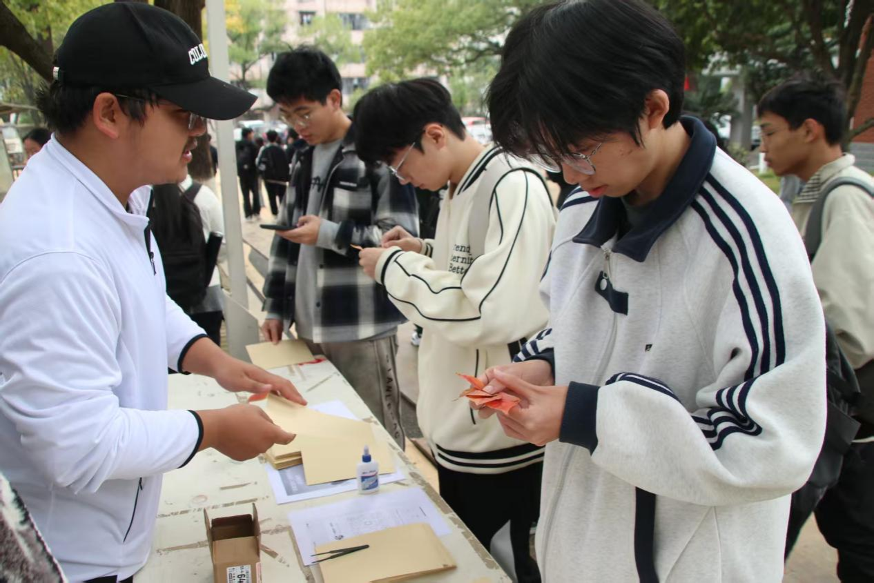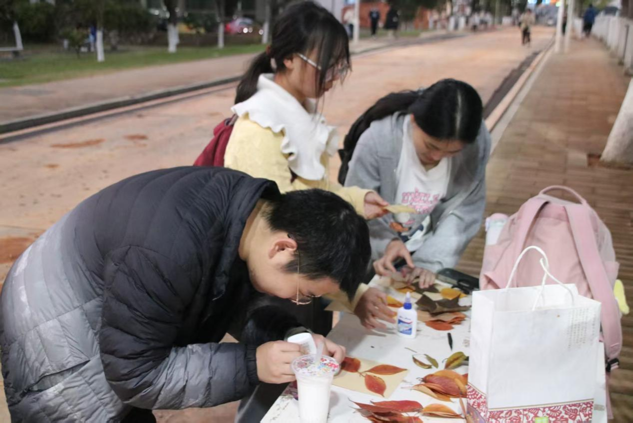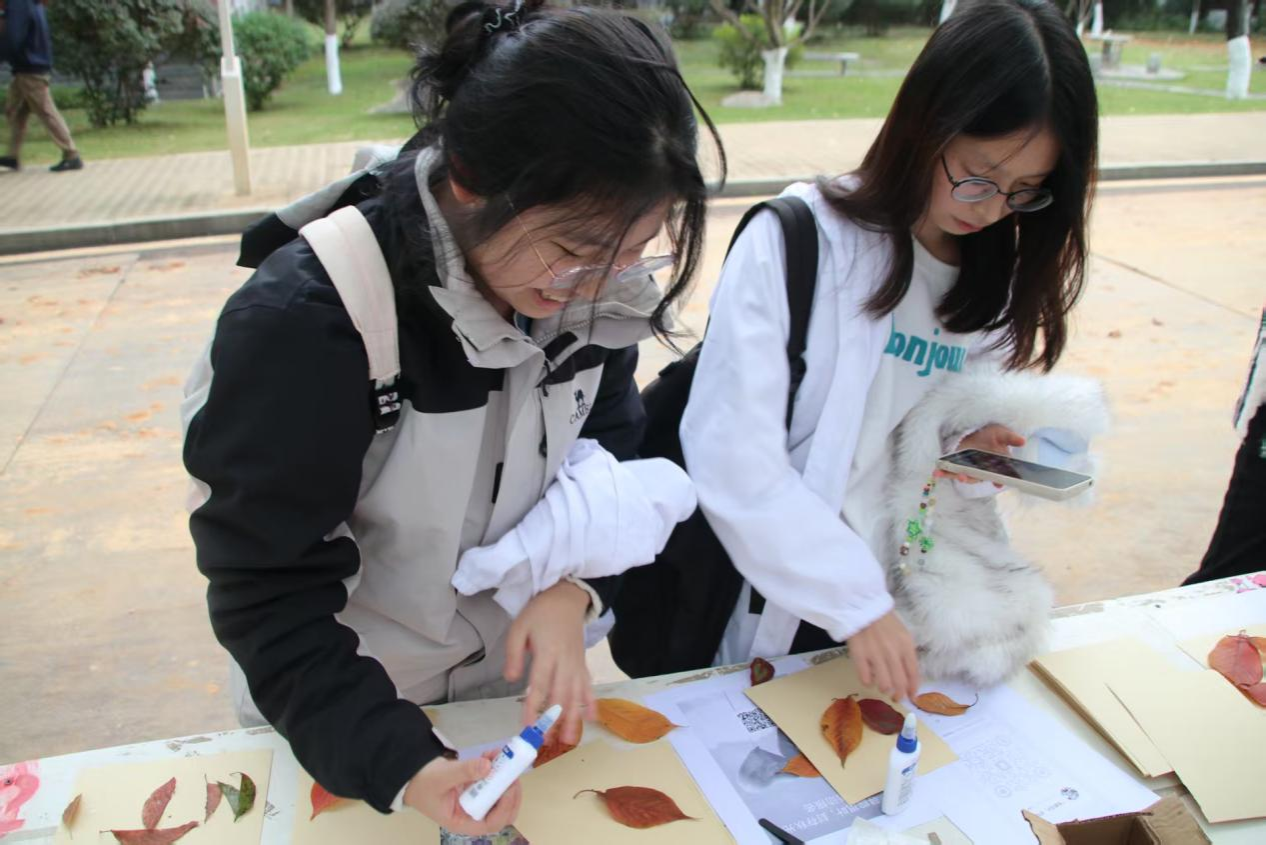 活动伊始,部门成员们将胶水和背景卡纸放至校园主干道摆点处,并向同学们介绍活动的主题与参与方式。参与的同学领取卡纸后,可自主选择两种材料来源:一是在校园银杏林或花坛拾取凋落的落叶、花瓣、细枝等自然素材,二是使用摆点处提供的多样干燥植物素材。随后,同学们可进行压花卡片的创作,通过胶水将所选材料在卡纸上拼贴成花朵、火焰、蝴蝶等图案。作品完成后,同学可与其合影留念并将其带回收藏,也可在活动规定的截止时间前,将作品提交至活动摆点处统一收纳。期间,学生们参与程度高,现场氛围活跃。