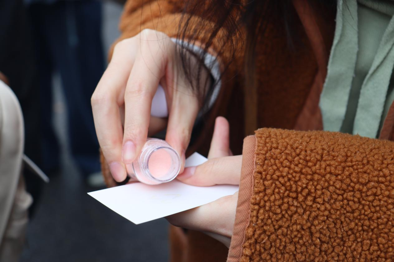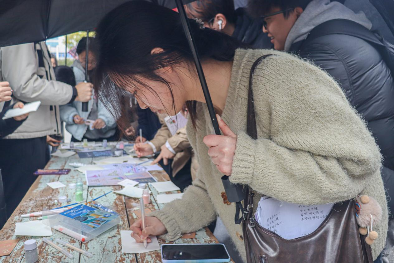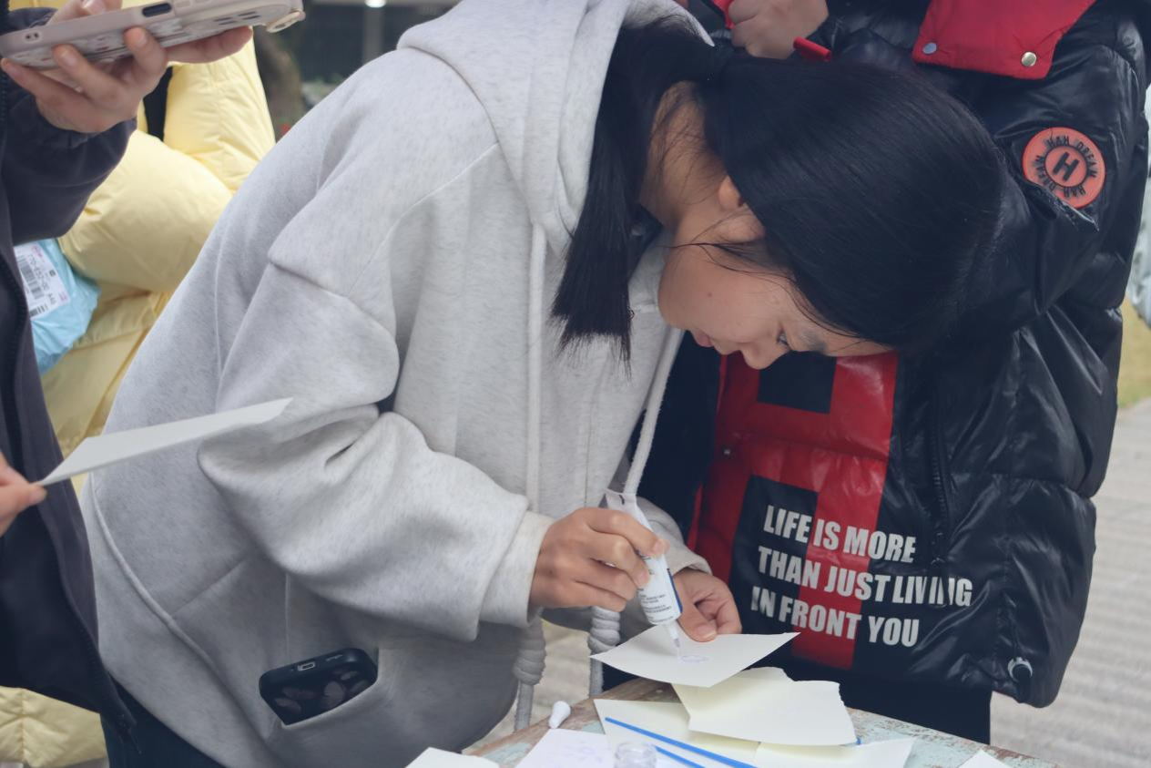 活动现场,工作人员全程在岗维护现场秩序,同步做好物料补给、疑问解答等全流程服务,并为同学们免费提供画纸、闪粉、胶水等创作材料。大家可自由发挥创意,以闪粉为笔描绘心中的幸福图案、暖心画面。活动一经开启便吸引大批同学踊跃参与,现场创作氛围轻松治愈,人气持续高涨。同时,优秀作品也在现场集中展示。