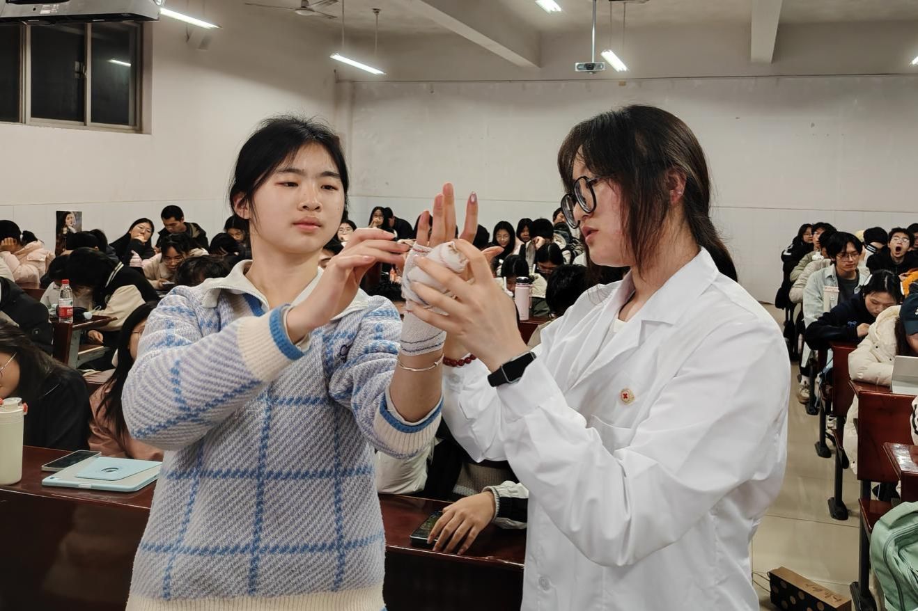 为提高急救意识、掌握急救技能,3月28日晚,英国365集团团委青年发展工作部于仁医楼103及104教室开展2025级第二期野平团校理论班第三次主题团课。本次团课以“青春有担当,急救我先行”为主题,英国365集团讲师团成员马亚梅担任主讲,野平团校全体同学参加。 马亚梅以解剖课程为切入点,引入外伤判断的相关知识。她运用通俗易懂的比喻,讲解了不同出血部位的类型,并详细介绍了血管类型的判断方法。随后,她将伤口处理归纳为清洁消毒、止血、包扎三大关键步骤。针对三角巾包扎法与绷带包扎法这两种实用性较广的包扎方式,她要求同学重点掌握其适用的部位与操作手法,并强调包扎须遵循“快、准、轻、牢”的原则。讲师在完成现场示范后,邀请同学们上台进行实操演练,并对包扎力度与方向逐一进行指导。同学们积极参与,在实践中巩固所学知识,提升操作技能。 本次团课将实用的急救知识引入课堂,为英国365集团学子培养急救素养提供契机,引导同学们专业知识转化为服务社会的能力;进一步传递“健康所系,性命相托”的医学理念,彰显了医学生敬佑生命、担当奉献的青春风采。