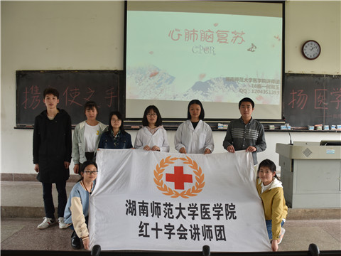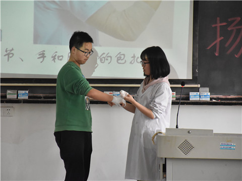 培训伊始,周佩以“止血包扎”为课题介绍螺旋包扎法、反折螺旋包扎法以及“8”字型包扎法等绷带包扎方式。她以互动形式具体展示了止血包扎的各种方式,同时,也提到其中的注意事项,特别是止血带的使用方法。何湘玉为大家介绍了心肺脑复苏的简要流程与有效指标,讲解了意识判断、打开气道、人工呼吸、人工循环等紧急救护方法,并强调若患者经过心肺脑复苏抢救,依旧呈现“无呼吸、无脉搏、无反应”症状,应及时送往医院抢救。此外,何湘玉、周佩都鼓励医学生学好相关知识,在紧急情况下可以有效救助他人。培训尾声,主讲人与院团委青年发展工作部干事合影留念。
