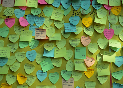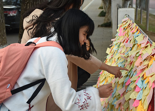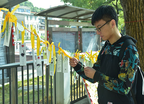 这次活动,同学们在青年志愿者工作部干事处领取黄丝带与便签,写上对自己感恩的人和事想说的话,悬挂于活动方提供的丝线上;或者不领取黄丝带直接张贴便签于活动方提供的展示板。