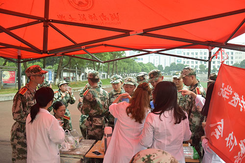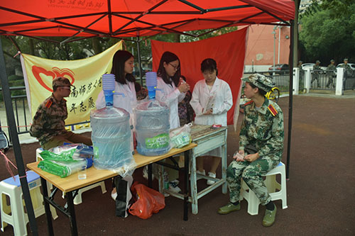 每年我院的爱心服务队会伴随新生军训一直到结束,志愿者们接受培训后轮番值岗,这是我院一大特色,既发挥了医学生的优势,更能让新生们感到我院的温情。