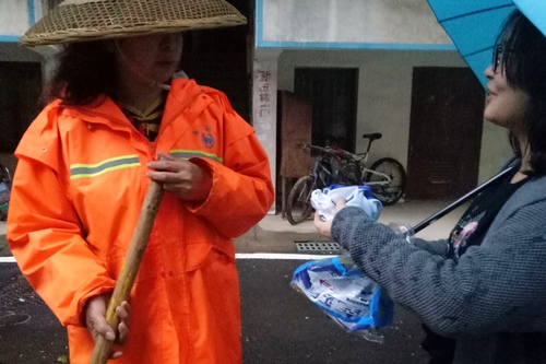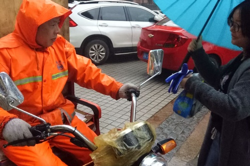 志愿者们6点开始准备送给环卫工人的礼物,即手套与口罩。6时30分志愿者们分小组,出发去岳麓区各主要街道,一路步行,寻找正在工作的环卫工人。志愿者们看到正在扫地或者推着清洁车的环卫工人,便走上前去问候他们,将手套与口罩交到环卫工人的手中。环卫工人们都带着笑容对志愿者们说:“谢谢!”有的志愿者在礼物不够时,自己出钱进超市采买礼物,给环卫工人送去关心。