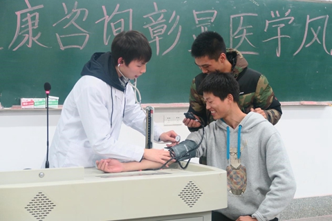 在主持人致开场白并强调讲座注意事项以及相关纪律要求之后,团课正式开始。此次讲座的三位主讲人分别从血压、血糖、血型三个方面介绍了其相关定义以及合理的改善方法,他们现场为同学们演示了血压计、血糖仪的使用方法,并运用专业的医学知识对生活中一些常见的医学误区进行了解答。在讲座过程中,主讲人与学生之间进行了互动,如为学生测血压、血糖,学生间互相测血型等。此次团课所宣讲的健康知识在加强了医疗卫生知识普及的同时,也培养了广大团员对义诊服务的兴趣。讲座结束后,主讲人及团课工作人员合影留念。
