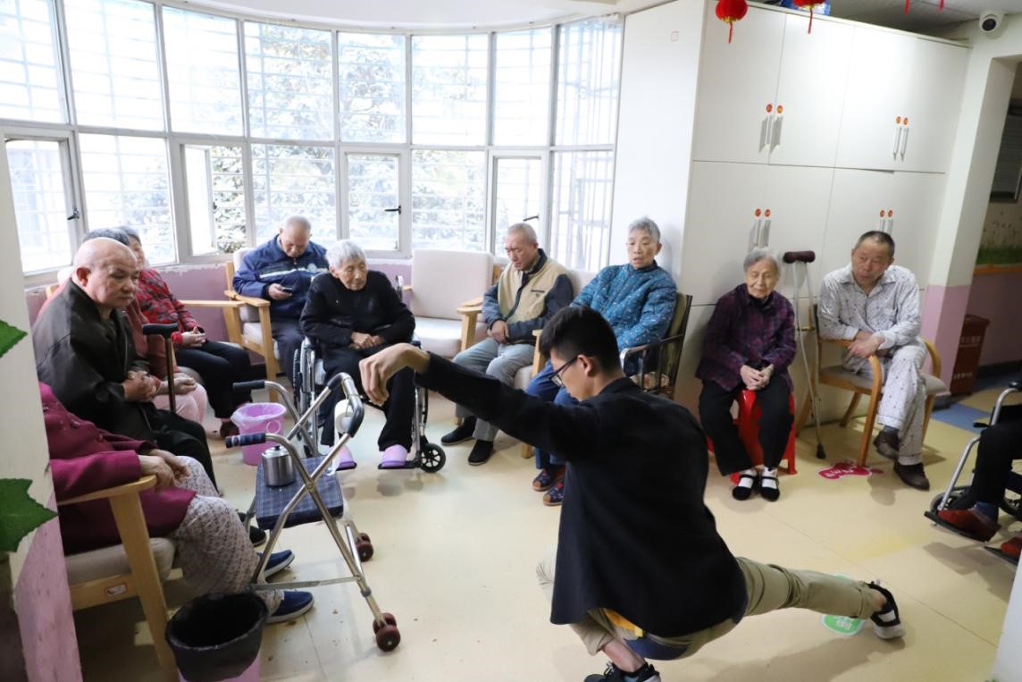 负责人与养护中心交接好相关事项后,活动正式开始。全体志愿者以经典红歌《强军战歌》作为开场表演,志愿者声音响亮有力,老人纷纷鼓掌,歌词“听党指挥、能打胜仗、作风优良”更是引起老人大声叫好,不少老人一起合唱。而我院经典的二十四式简化太极拳将活动推向了高潮,除此之外,志愿者还带来了优美典雅的古风舞、活力十足的双截棍表演。表演进行时,部分志愿者蹲在老人身旁,和老人聊天、共同欣赏节目,相处十分融洽。表演最后在湖师大校歌歌声中结束。