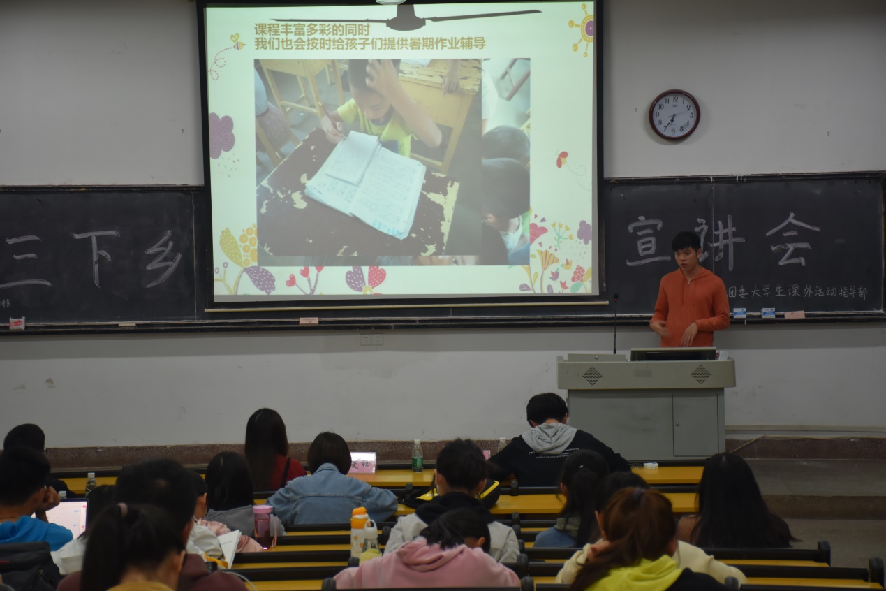 活动伊始,主持人孙佳康简述三下乡相关背景并依次介绍主讲人。宣讲期间,朱雯钰首先就自身经验简介了其暑期社会实践团在前期准备、实施过程、后期宣传、成果汇报等方面的工作内容,她提出:“天使在人间,志愿攸州行。帮助贫困山区的人们是十分有意义且必要的,是件值得铭记一生的事情。”随后,苏湘杰指出三下乡是一个以团队的形式将文化、卫生、科技带下乡的社会实践活动,其团队以分组形式将队内人员依次分为调研组、支教组、后勤组、宣传组、健康宣讲组,他向众人一一介绍了每组成员的工作内容,并表明了三下乡活动的艰辛苦累。最后,刘乔从工作概况、工作历程、成果展示等方面给予了众人很多指导性的意见,并结合自身经历提醒了大家活动中可能存在的问题及注意事项。