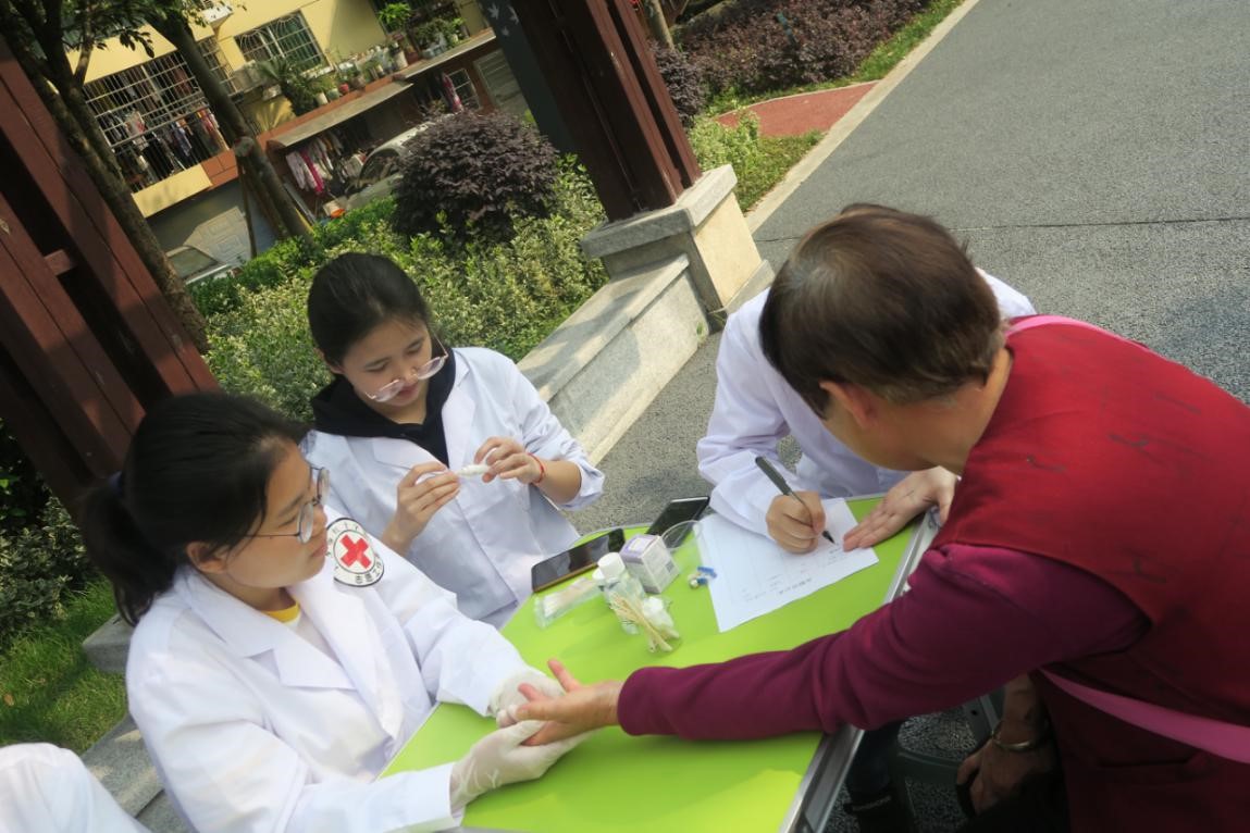 负责人杨淑媛带队到达目的地后,志愿者做好准备工作,活动正式开始。健康咨询队主要给社区居民提供测量血压、血糖、血型和健康咨询的服务。活动过程中,志愿者们主动邀请社区居民进行测量。测量血糖前,志愿者会先询问居民是否吃早餐以及吃早餐的时间。测量血型后,志愿者还会向居民解释判断的依据。测量血压时,遇到高血压的患者,志愿者们会询问他们的日常作息并给出相应建议。居民们纷纷对志愿者们表示感谢。