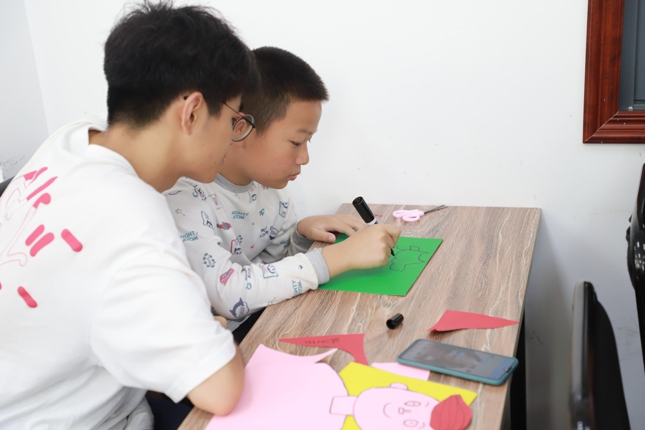 在绘画的过程中,志愿者帮助孩子将自己想象的场景画在纸上,带领孩子们去关注各种绘画元素之间的大小比例和色彩搭配,并时刻注意孩子们的安全,教会孩子们如何安全地使用画笔和剪刀等工具。在志愿者的照顾下,孩子们最终完成了自己的作品,并积极地向老师和家长展示、讲解。