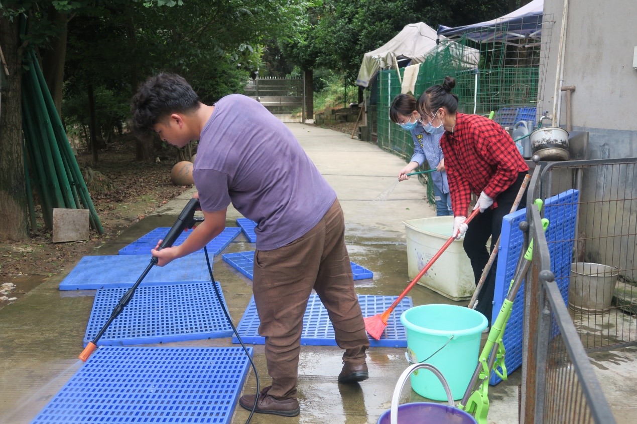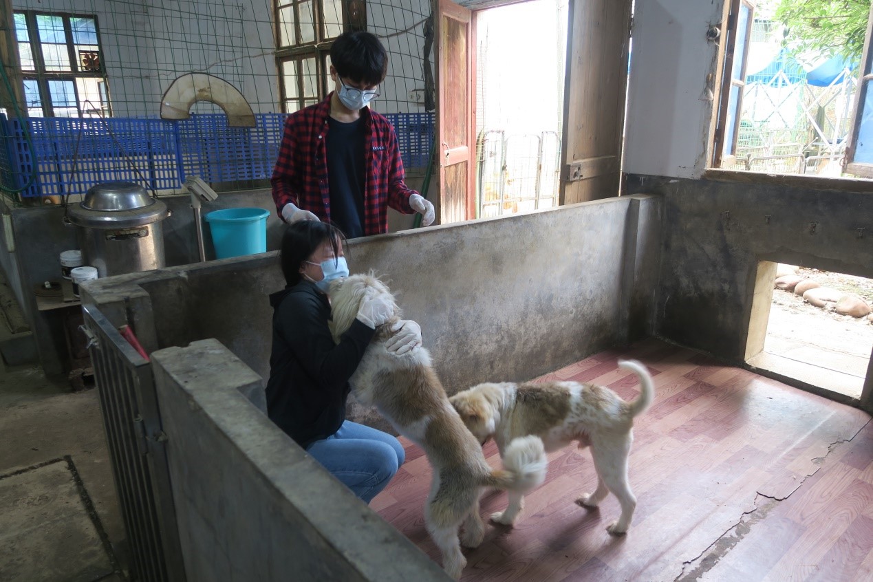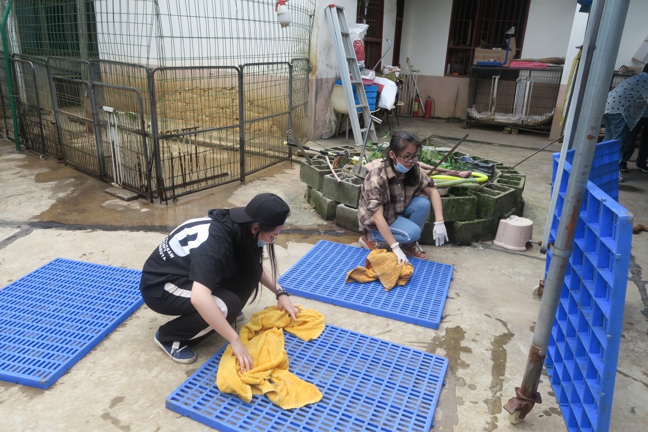 参与义工服务的志愿者抵达星星小院后,在星星小院里,志愿者为流浪狗收拾粪便,为它们提供一个舒适的生活环境。而一部分志愿者用水桶将水提至到大水箱旁,协助工作人员清洗有污渍的塑料板,随后将其用毛巾擦干,为下一次小狗使用做好充分准备。还有部分志愿者边抚摸小狗并为其刷毛,使它们拥有一个良好的形象。