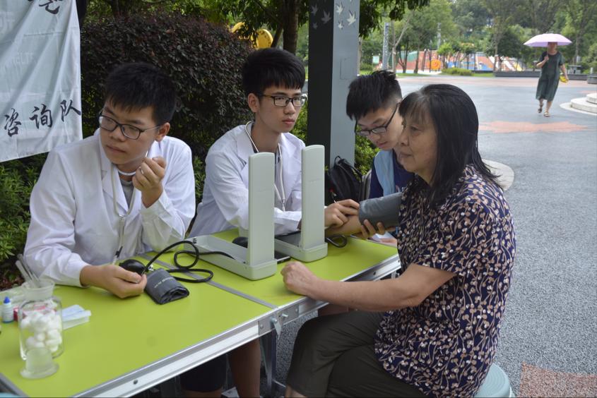 与此同时,健康咨询队成员前往龙王港社区进行健康咨询,具体内容包括免费为居民测血型、血压和血糖。测量前,健康咨询队队员会先询问被测量者几个小问题,如果符合条件,则进行测量,如若不符合要求,则会建议休息两个小时后再来或下次再来。测量结束后,队员们还会根据具体情况给予居民在饮食和生活上的小建议,普及医学小知识。