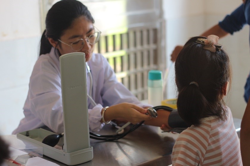 首先队员们给部分同学们测量了身高体重等一些常规检查,部分同学和家长则进行了血压血糖等血常规检查。在血压血糖测量过程中,队员询问了测量者早晨的饮食和运动状况,对于测量结果给出了判断,并针对测量者的血压血糖高低给出了建议,如少摄入高糖食品、合理饮食等。