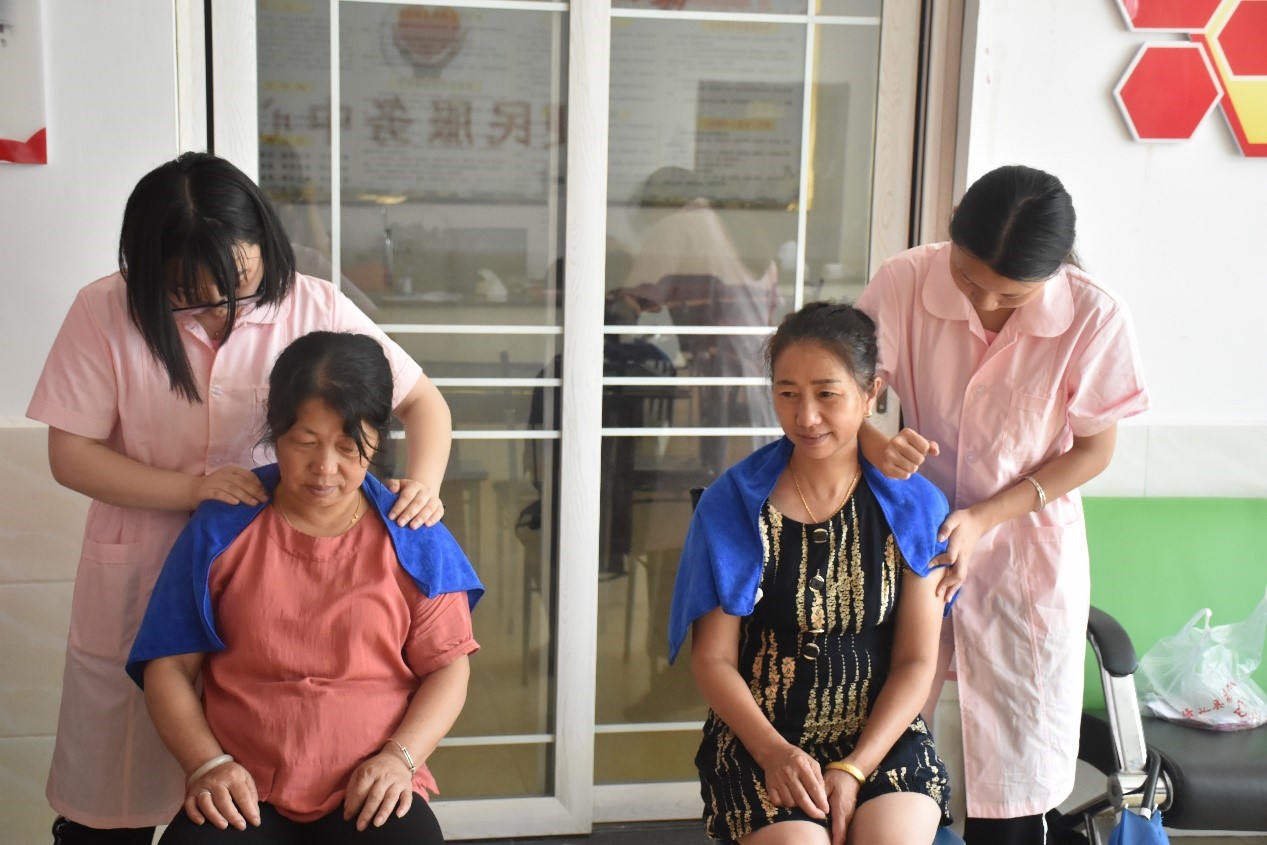 宣讲结束后,主讲人将老人们领到一楼大厅健康咨询处,健康咨询队队员开始给老人们测量血压、血糖,进行推拿服务,同时根据老人们个人身体状况提供适当的建议,给老人们普及健康生活方式的知识。