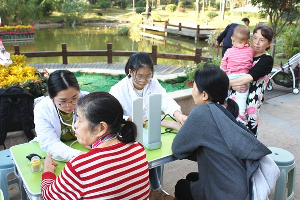 活动中,志愿者们首先询问居民自身情况并结合测量实际结果后,告诉居民测量的正常值并提出有针对性的改善建议。部分居民主动告诉志愿者生活习惯和既往病史,询问其身体状况的健康程度,并咨询了保持身体健康的有效方法。对此,队员们凭借自身的医学知识针对居民不同的身体健康状况,给出了不同的护理保健措施来帮助居民保持身体健康。