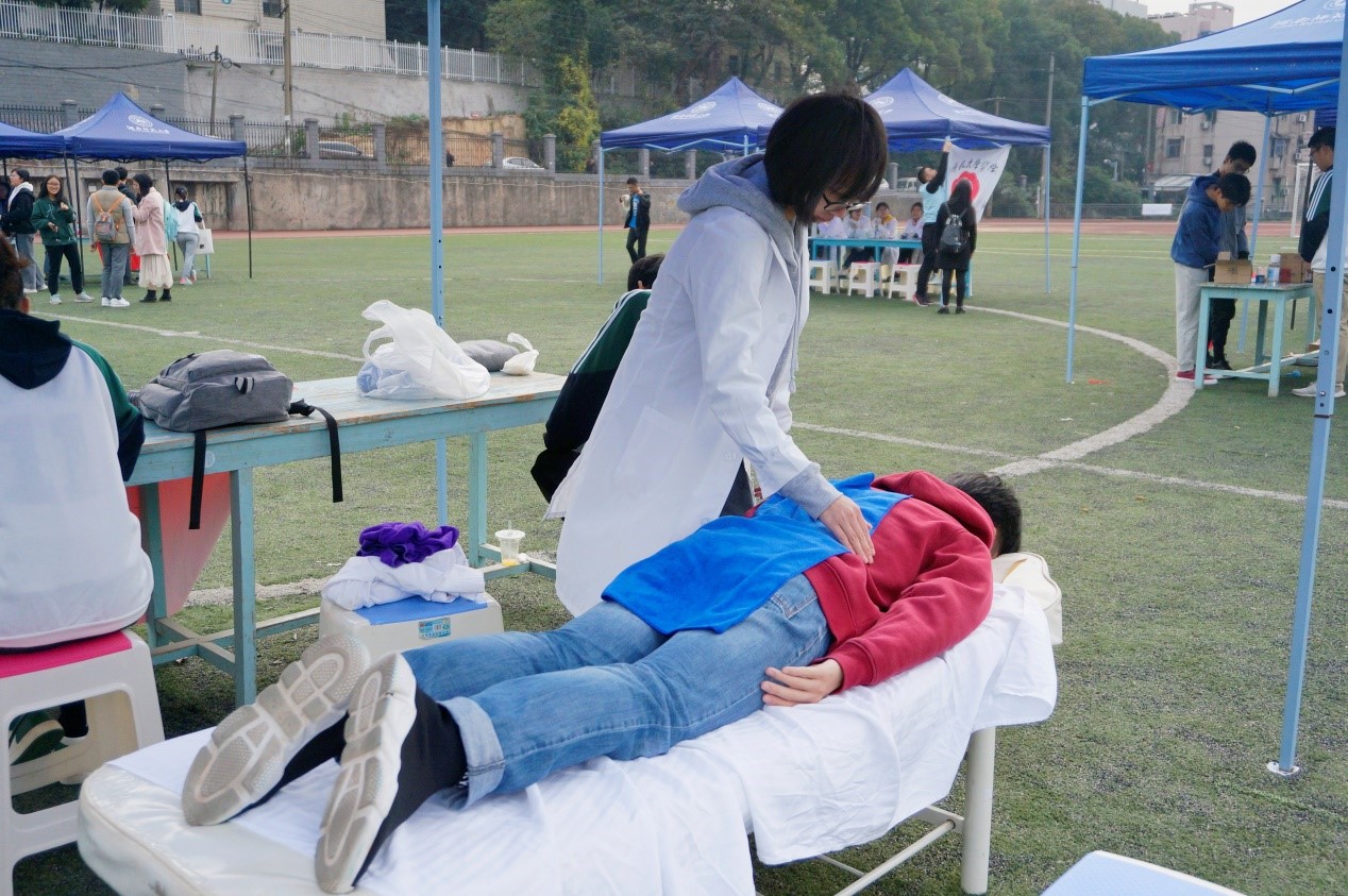 此次文化节的线下活动主要包括人体标本展、校园义诊、推拿体验、星级大闯关、琥珀制作、知识竞赛。上午9时开始,我院仁医楼人体形态科教馆对外开放,吸引了不少学生前来参观。馆内陈列了各式人体形态结构标本,由接受培训的学生志愿者担任讲解员,为前来参观此次人体标本展的学生介绍展品以及解答疑惑。与此同时,篮球场上的多项活动也在进行。校园健康咨询活动中,我院健康咨询服务队队员为学生们测量血压、血糖和血型,并就测量结果提出合理建议。另一侧的推拿体验活动上,我院医学社推拿队成员通过推、按、捏、揉等手法为前来体验的学生舒缓颈背部酸痛。在星级大闯关环节中,参与学生两两组队,依次完成“成语接龙”、“你画我猜”、“器官拼图”、“背球功夫”、“医学解密”等挑战性与趣味性兼并的项目。在勤医楼七教室里也同步在进行医学文化的相关知识竞赛,前来参赛的同学认真答题,知识竞赛顺利进行。此次文化节线下活动持续到下午4时。