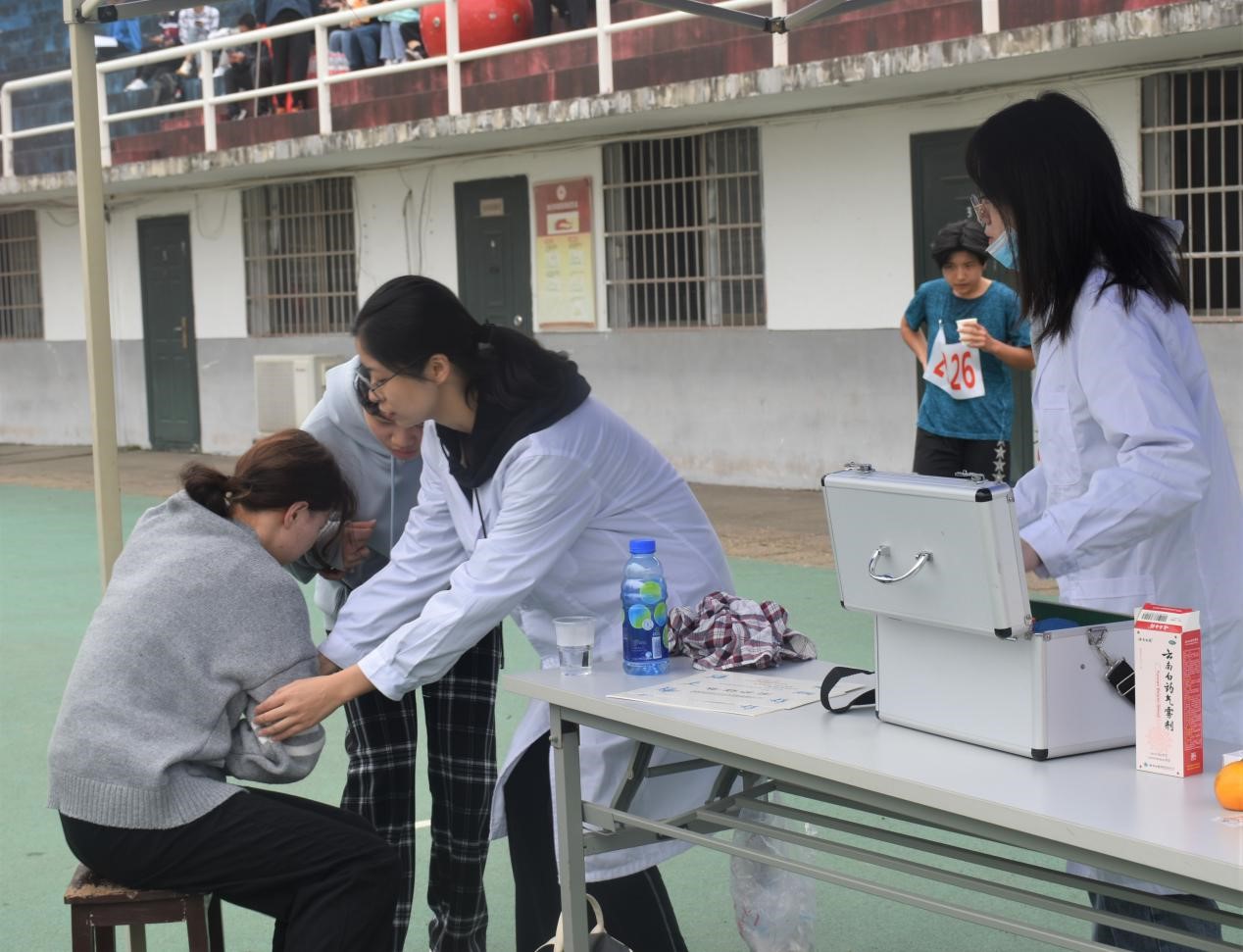 爱心服务队的成员与此次活动的相关负责人在活动前了解了相关注意事项,做好医疗准备工作,在医疗点静候,为有需要的运动员提供及时的帮助。运动会期间,爱心服务队的成员主要负责照顾伤病运动员,他们有的搀扶在运动过程中受伤的运动员前往医疗点处理伤口,有的为运动后低血糖的运动员递上红糖水等补充能量的食物,或是在田径场穿行,关注赛场上的一举一动,为运动员的健康保驾护航。