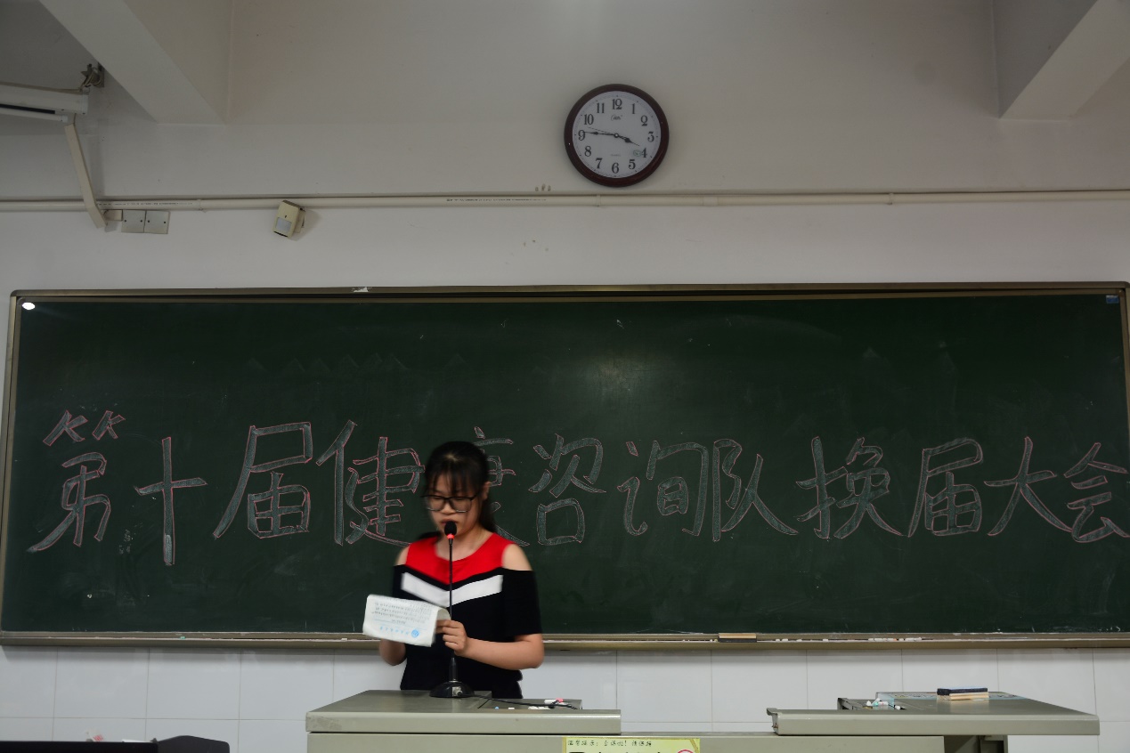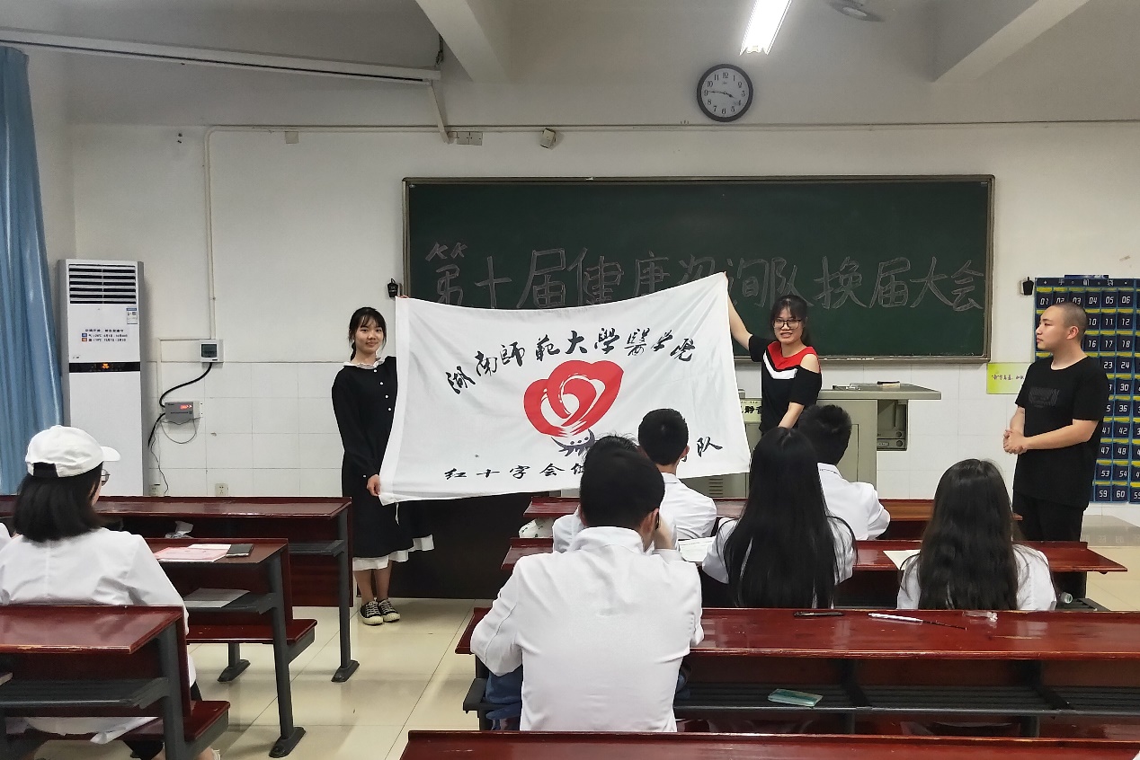 大会伊始,聂徽对此次活动做了简要的介绍并宣布换届大会正式开始。首先,由第十届健康咨询队副队长李思思同学进行发言,她认为工作纵然辛苦,但是大家更要注意身体,并表示同在健康咨询队这个大家庭里,大家都要互帮互助。其次,第十届健康咨询队队长王尔聪同学也进行了发言,他概述了过去一年里健康咨询队的工作情况,并对新队员提出展望。接下来,由院团委青年志愿者工作部负责人乐如为第十届健康咨询队的成员颁发聘书并合影留念。紧接着是庄严神圣的授旗仪式,新老队长队旗的交接体现着一种传承,传承着奉献、友爱、互助、进步的志愿者精神。然后由第十一届健康咨询队队长杨雯婕发言,她表达了对20级新队员的欢迎,并对新的一年做出了规划。最后,由20级的新队员们进行了自我介绍,大家彼此更添熟悉。在一片欢声笑语中,大会落下了帷幕。