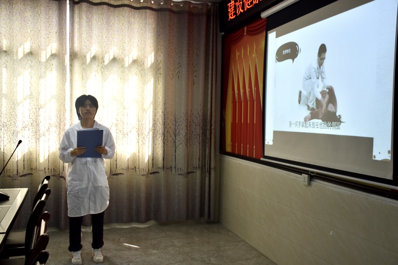 此次宣讲会以“心肺复苏”为主题。王荣首先介绍了心肺复苏的定义及心肺复苏适用的大致情况,让居民们对心肺复苏有了大致的了解。其次,她将心肺复苏的前期准备工作概括为“一看、二唤、三呼、四摆放”,向居民们展示了转移患者及判断患者有无呼吸与意识的正确方式,并通过视频更加直观地让居民们学习如何摆放恢复体位。在学习心肺复苏的实际操作阶段中,王荣将其分为胸外心脏按压、开放气道、人工呼吸三个部分。她运用图片和视频等方式配合讲解,生动形象地讲述了心肺复苏的操作方法,着重讲解了心肺复苏的注意事项以及在心肺复苏过程中遇到问题的解决方式。除此之外,她简略地介绍了自动体外除颤仪即AED的使用方式和配合心肺复苏的使用方法。最后,她配合视频完整地概括了心肺复苏的流程。