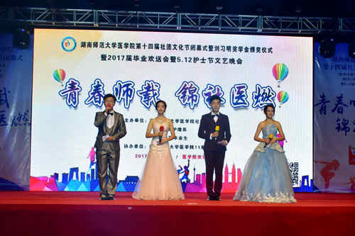 5月14日晚7点,我院第十四届社团文化节闭幕式暨刘习明奖学金颁奖仪式暨2017届毕业生欢送会暨5.12护士节文艺晚会在我院田径场举行。我校副校长周俊武教授、长沙生殖医院院长刘习明教授出席晚会。