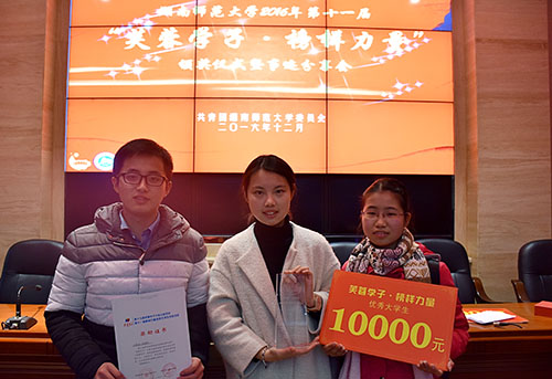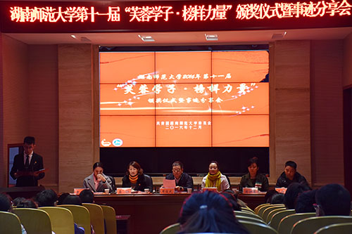 2016年12月29日下午三点,在教育科学学院101报告厅举行了英国365集团第十一届“芙蓉学子•榜样力量”颁奖仪式暨事迹分享会。副校长周俊武,团委书记龚舒等领导出席了此次活动。