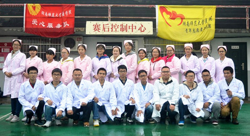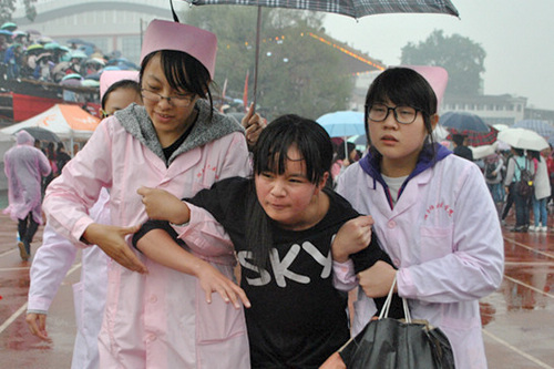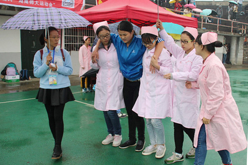 校动会前已有连续几天的降雨降温,恶劣天气给运动员的生理和心理带来巨大挑战的同时,也为爱心服务的协助工作增加了难度。爱心服务队的队员们坚守赛场,在赛场四周固定位置分摆几个点,以便能及时的在运动员们受伤后第一时间冲向伤员进行救治,后勤队员们也在指定地点给运动健儿们及时的送上一杯热水。据队员称,爱心服务队为了助力校运会,进行了两次专业培训。同时,队员们为解决运动场热水问题,不辞辛苦,寻找热水。我院爱心服务队风雨无阻,以专业的态度获得了一致好评。
